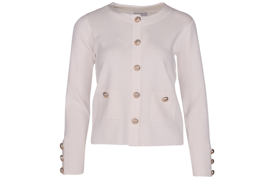 Leo & Ugo cardigan AE033. Dit rechtvallende model heeft een ronde hals en lange mouwen. Deze witte cardigan van Leo & Ugo sluit door middel van gouden knopen en is voorzien van steekzakken op het voorpand.