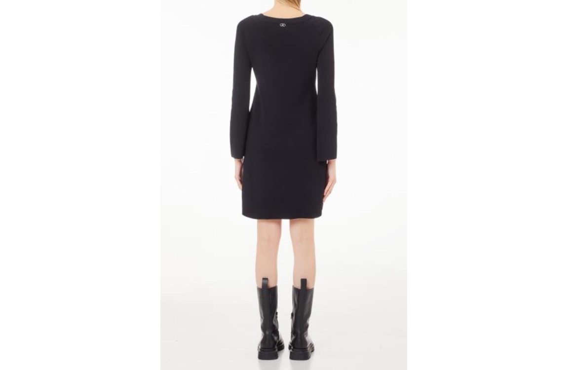 Liu Jo jurk WF4531MA05P22222. Dit licht getailleerd model heeft een brede ronde hals en lange uitlopende mouwen. Deze zwarte jurk van Liu Jo is gedetailleerd met een strikceintuur in een leer-look aan de voorzijde en is afgewerkt met een ribgebreide halsboord.