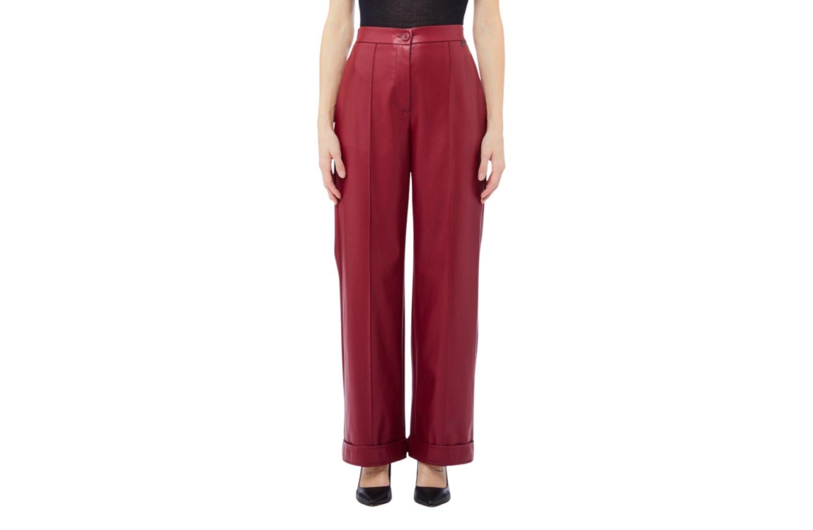 Liu Jo broek Pepper MF5069E0624. Dit wide leg model sluit door middel van een knoop en rits. Deze rode gecoate broek van Liu Jo is afgewerkt met een omgeslagen zoom aan de onderzijde en bewerkt met een geperste plooi aan de voorzijde.