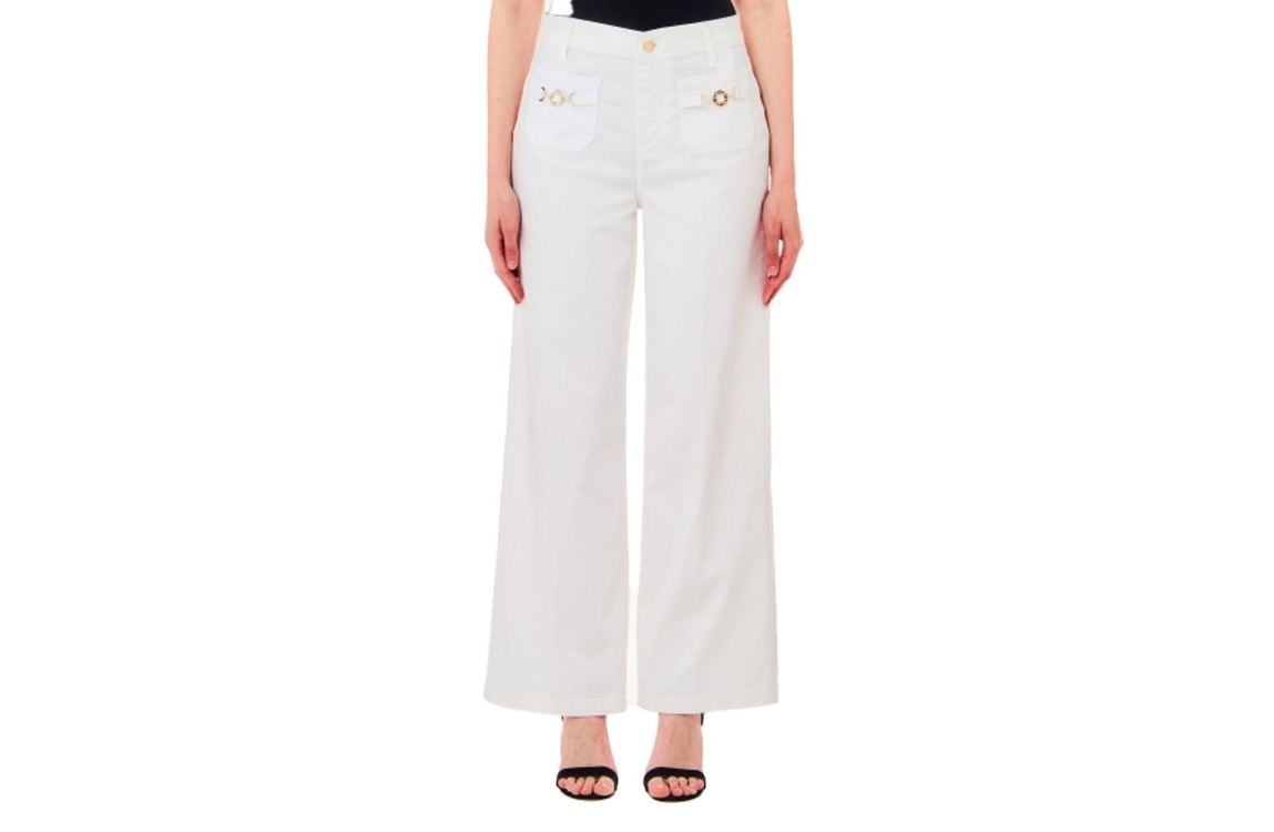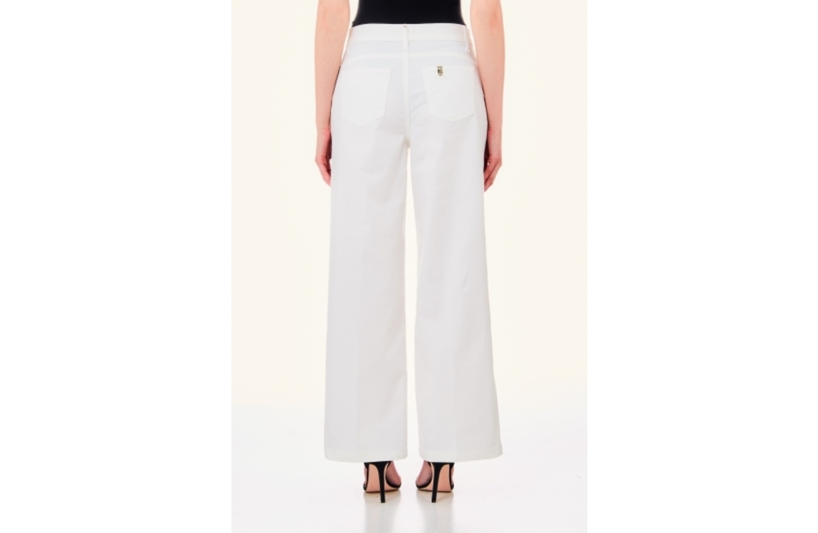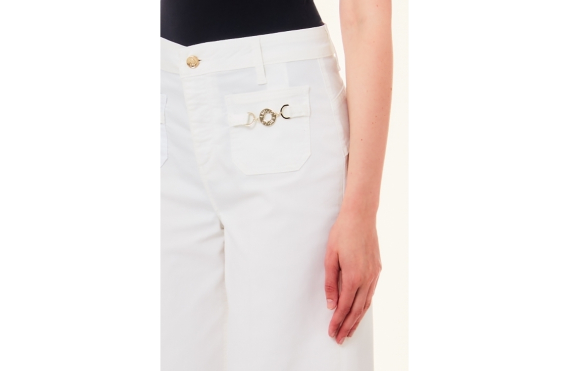 Liu Jo broek MA4276-T7144 11111. Dit wijdvallend model sluit door middel van knoop- en ritssluiting en is voorzien van ceintuurlussen. Deze witte broek van Liu Jo beschikt over twee steekzakken aan de voor- en achterzijde en is bewerkt met gespdetails op de voorzakken.