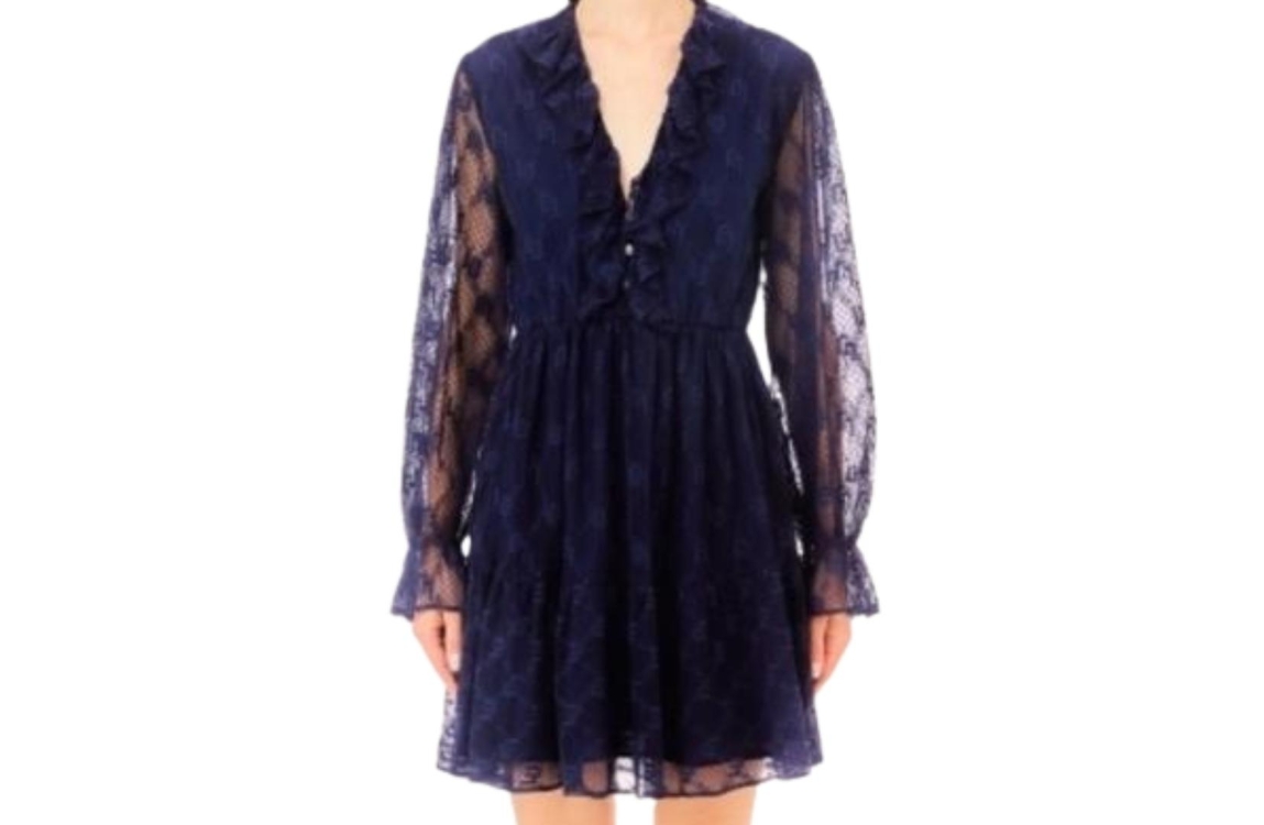 Liu Jo jurk MA4096-J4703. Dit rechtvallend model is voorzien van een v-hals afgewerkt met ruches en heeft lange mouwen. Deze blauwe kanten jurk van Liu Jo sluit door middel van knopen aan de bovenzijde en is all-over bewerkt met het logo. Dit model is onderaan de mouwen en aan de onderzijde afgewerkt met ruches en is gedeeltelijk gevoerd.