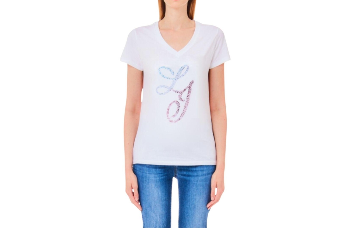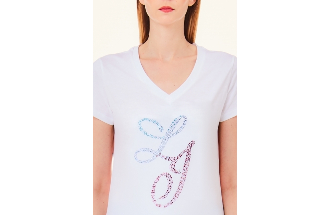 Liu Jo T-shirt MA4337. Dit rechtvallende model heeft een v-hals en korte mouwen. Dit witte shirt van Liu Jo is afgewerkt met het logo in strasssteentjes aan de voorzijde.