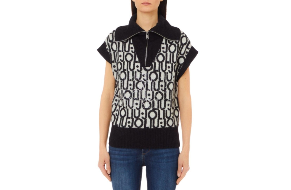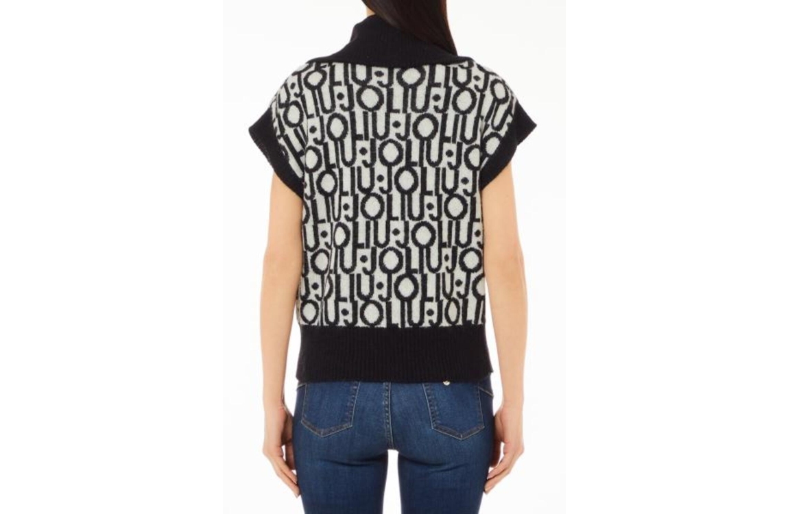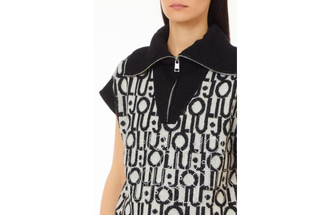 Liu Jo spencer wf4464ma30pn9958. Dit rechtvallend model is voorzien van een col dat sluit door middel van een rits en heeft korte kapmouwen. Deze zwarte spencer is bewerkt met een logo patroon en is afgewerkt met ribboorden.