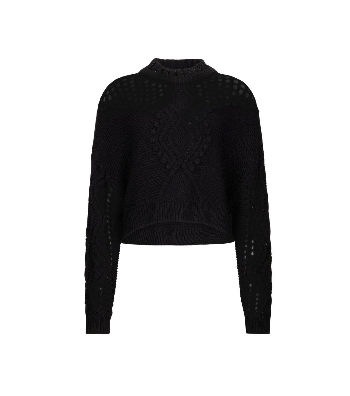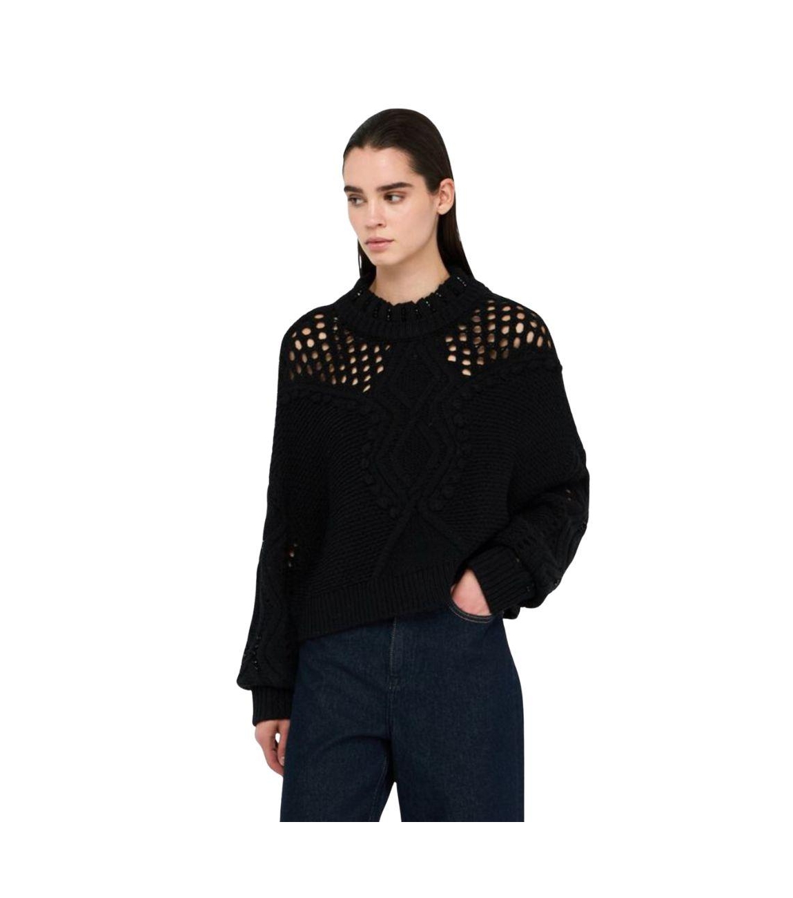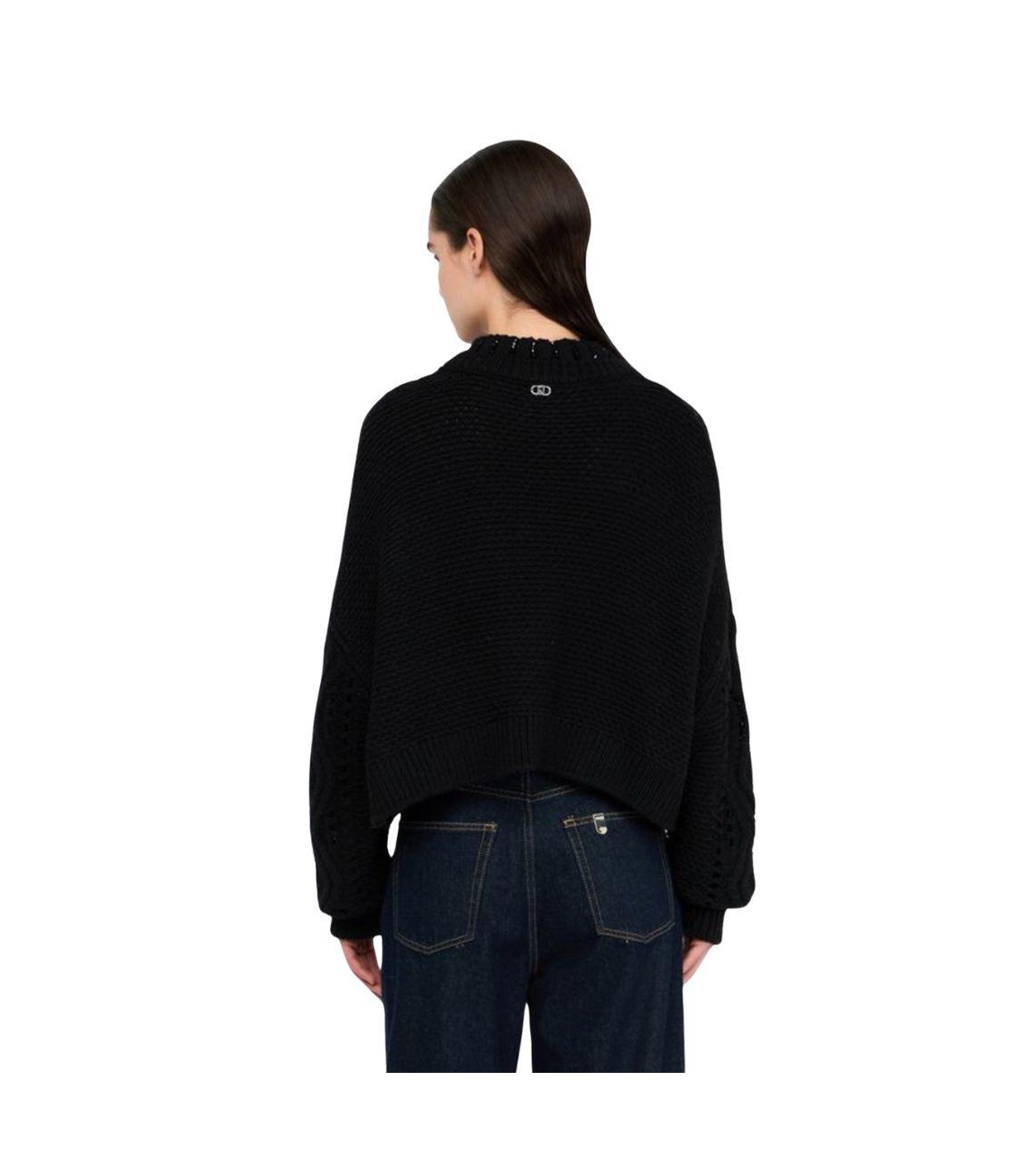 Liu Jo pullover MF5442MA930. Dit rechtvallend model is voorzien van een turtle neck en heeft lange mouwen. Deze zwarte gebreide pullover van Liu Jo is gedeeltelijk bewerkt met zwarte glinsterende steentjes en aan de bovenzijde open uitgevoerd.