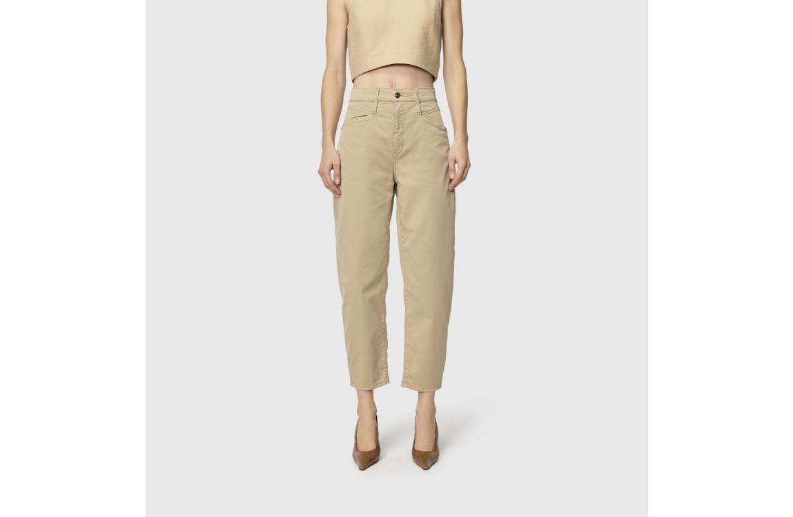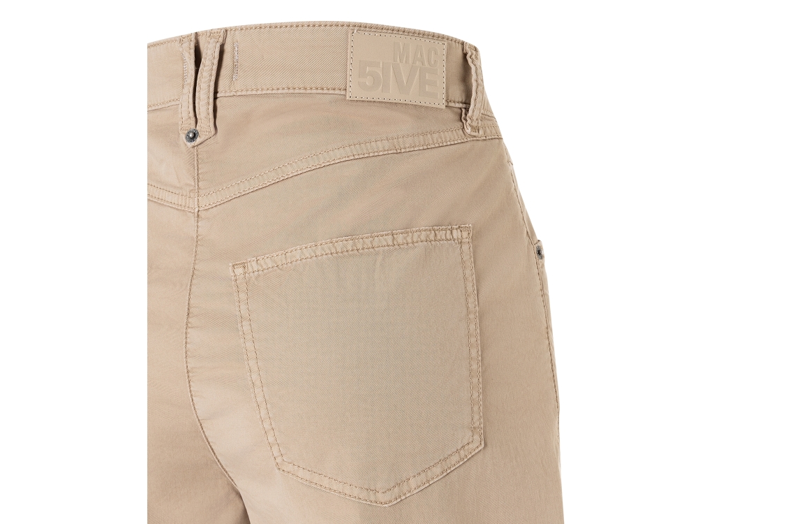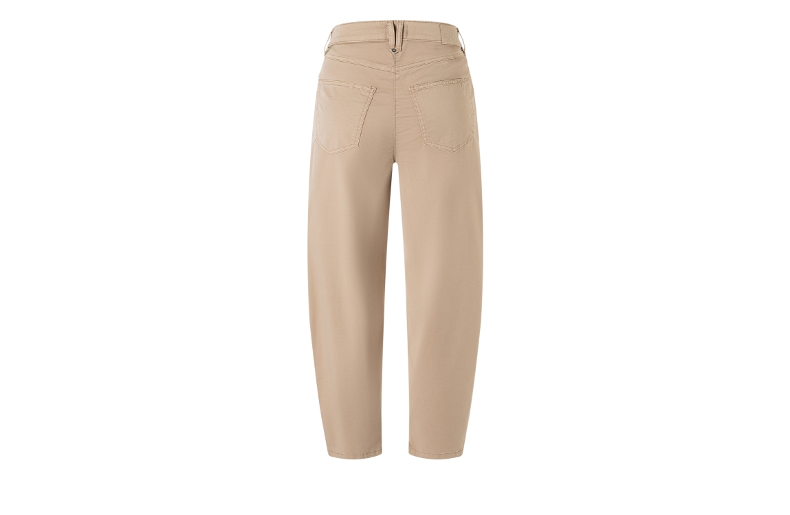 MAC BORA 257A jeans 0434L314100. Dit barrel fit model sluit aan de bovenzijde door middel van een knoop en een rits. Deze beige jeans van Mac beschikt over riemlusjes en verschillende broekzakken bestaande uit ritssluitingen en steekzakken. Dit model is cropped.