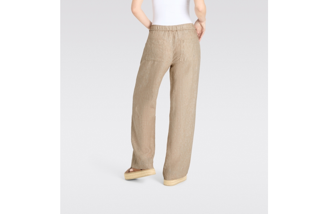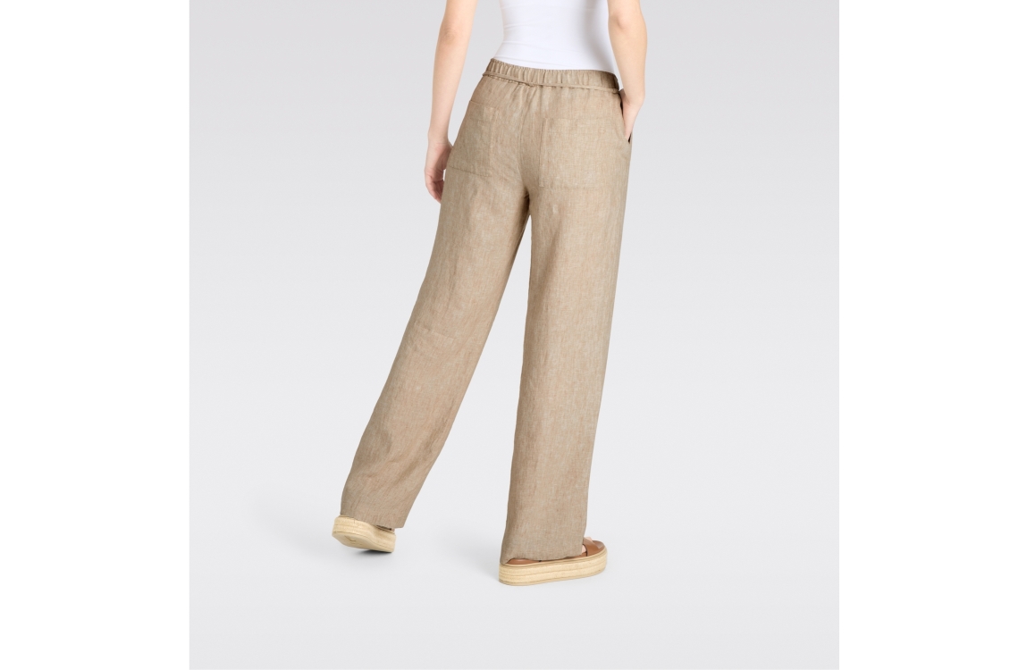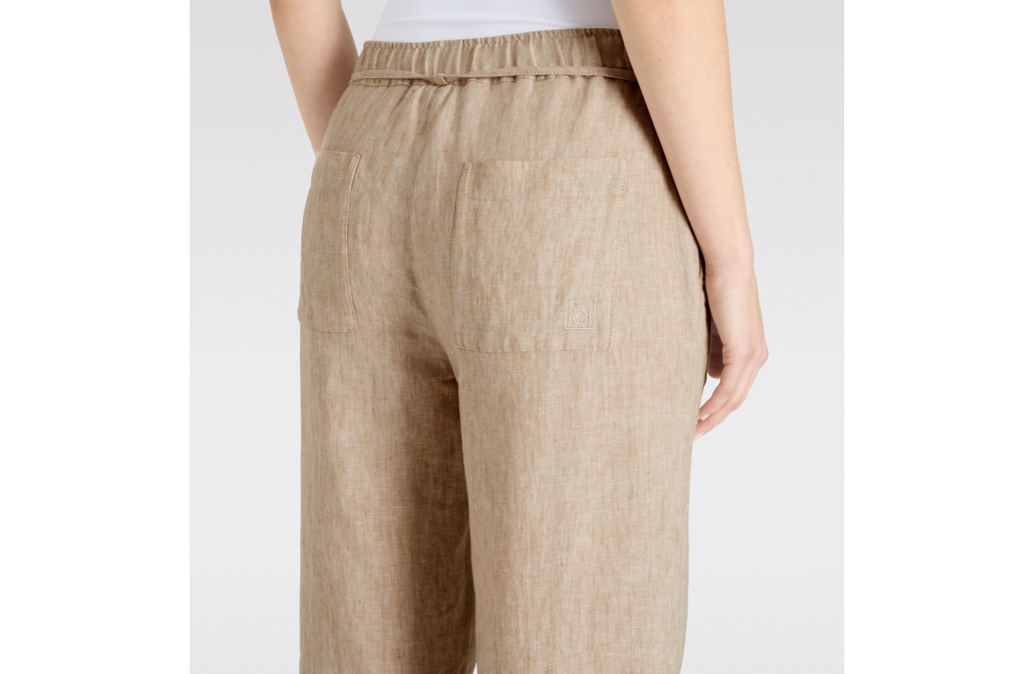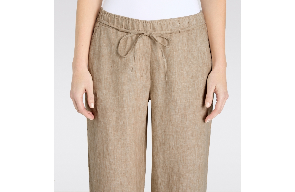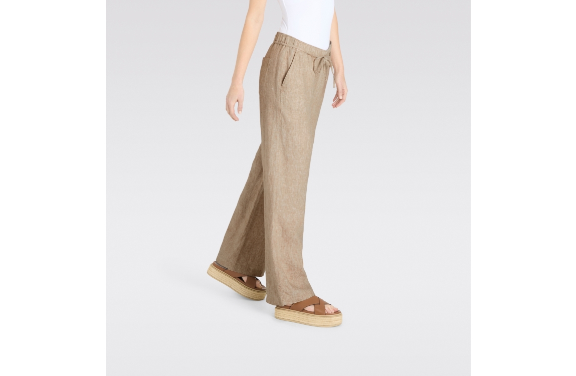Mac broek Chiara Belt 0294L344700. Dit wide fit model sluit door middel van een elastische boord met trekkoord. Deze zandkleurige broek van MAC is voorzien van twee steekzakken aan de voor- en achterzijde en is gemaakt van linnen.