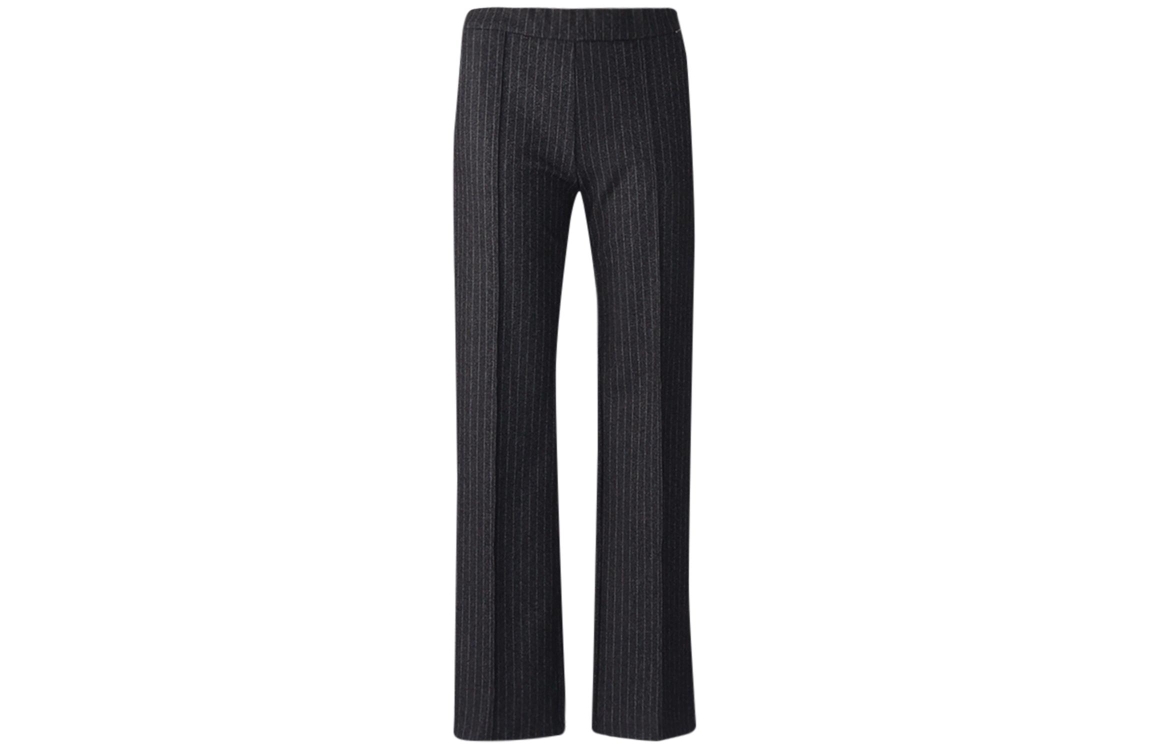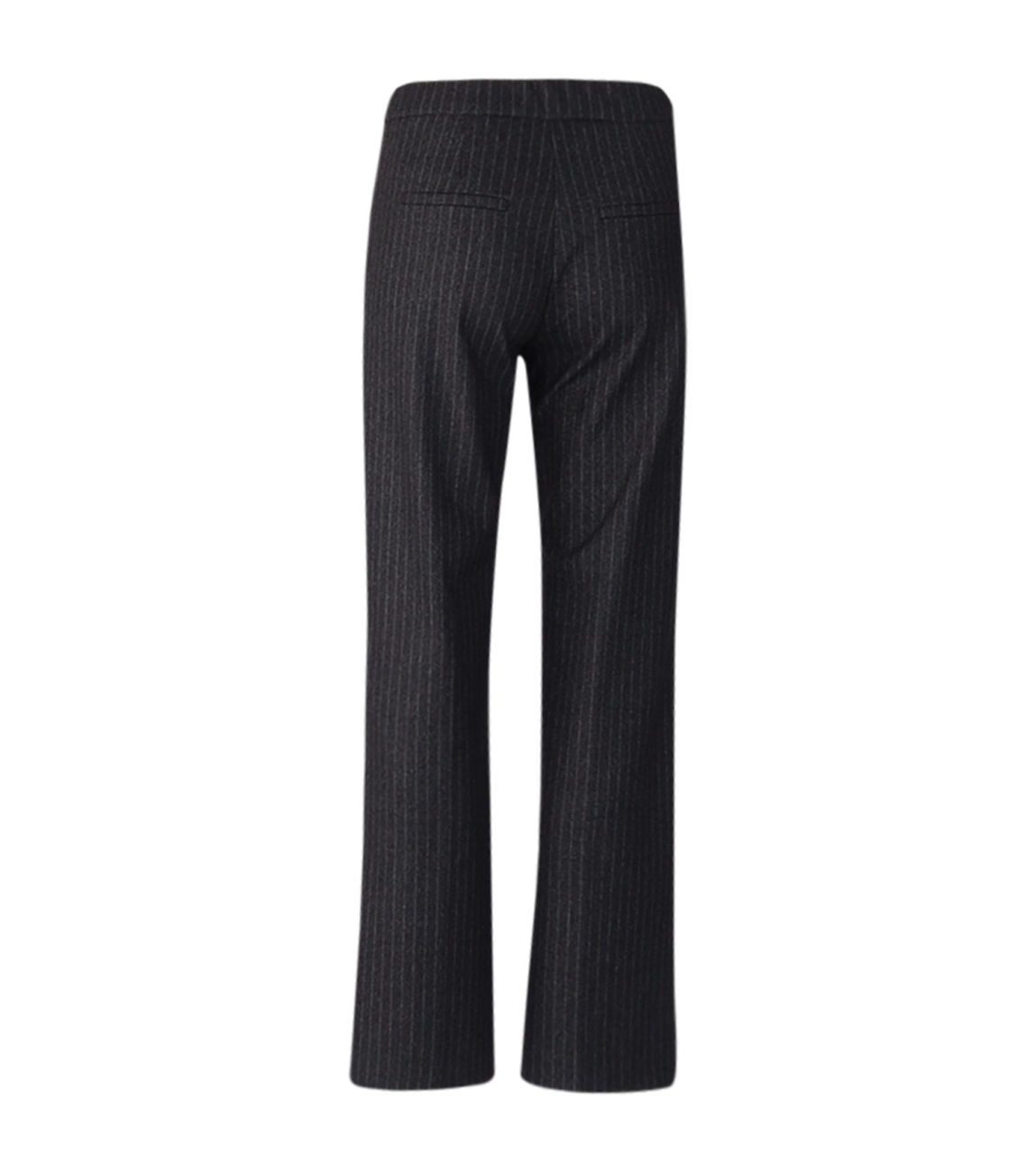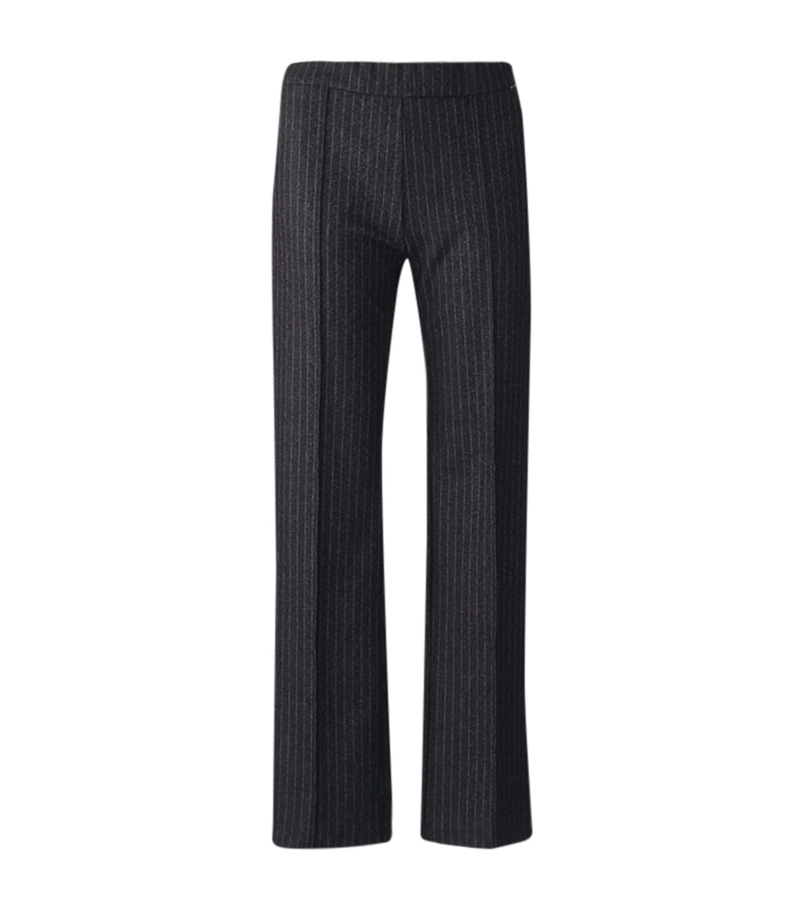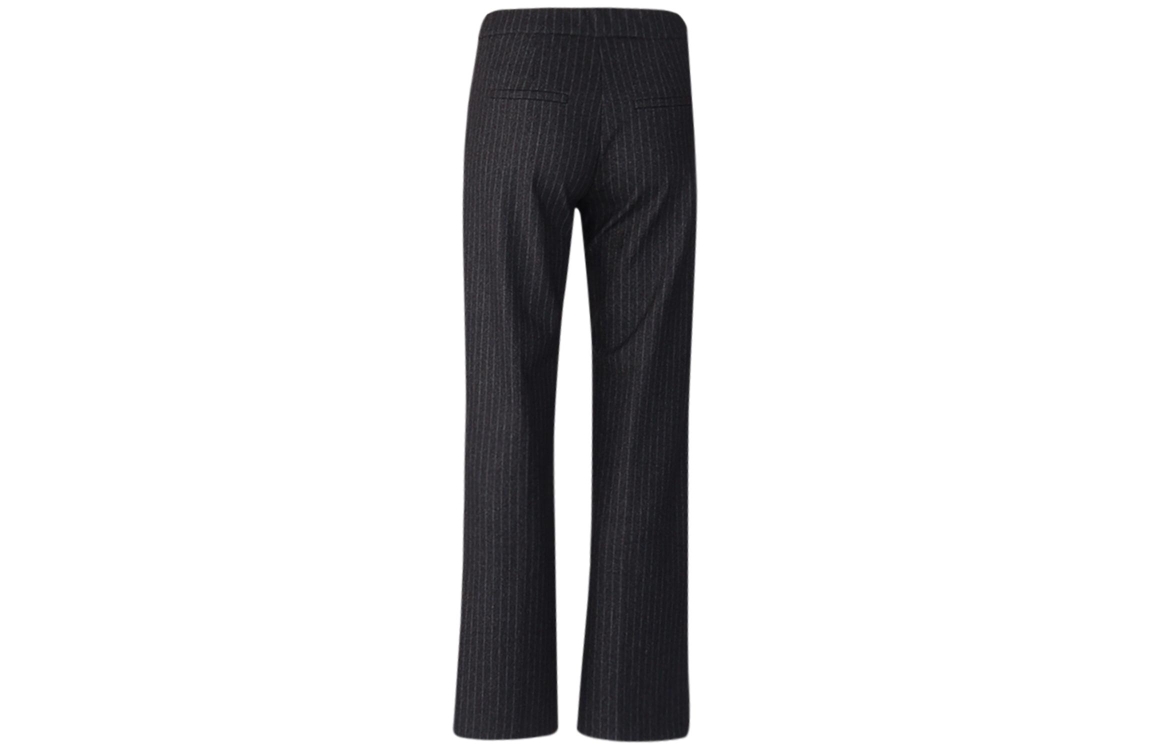 MAC jeans Chiara smart 302900 0114 073S. Dit straight fit model sluit door middel van een elastische tailleband. Deze donkergrijze broek van MAC jeans is all-over bewerkt met een streeppatroon en beschikt over twee steekzakken aan de voorzijde. Dit model is gedetailleerd met twee fake paspelzakken op de achterzijde en een naad wat over de lengte is verspreidt.