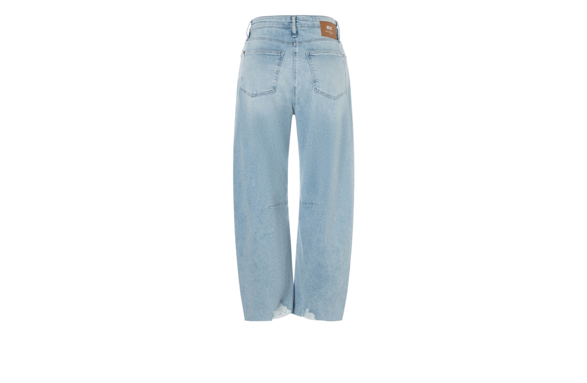 MAC jeans Dakota Sunny D197 0333312490. Dit barrel fit model sluit door middel van een knoop en een rits. Deze lichtblauwe jeans van Mac beschikt over stoere details en is afgewerkt met riemlusjes en verschillende broekzakken. Dit model is cropped en stretch.