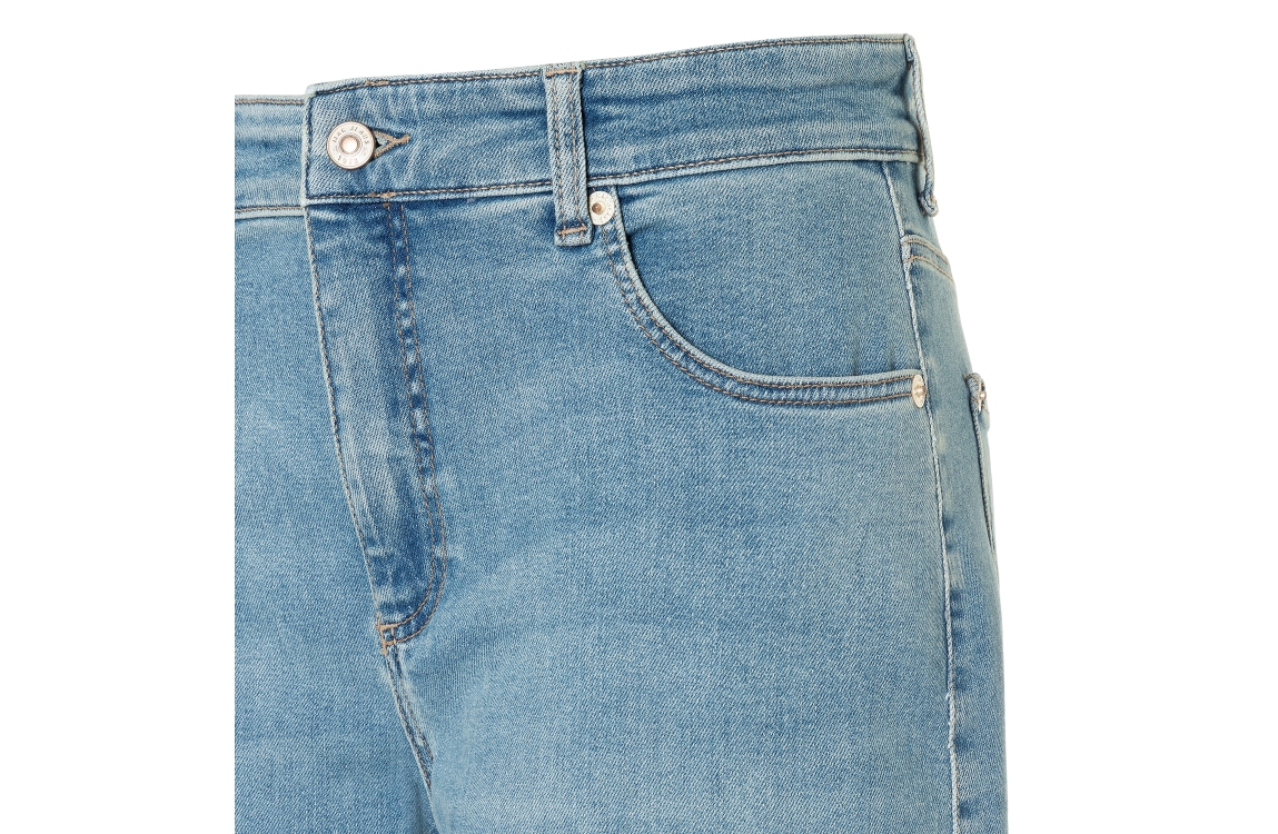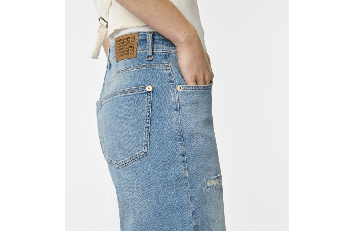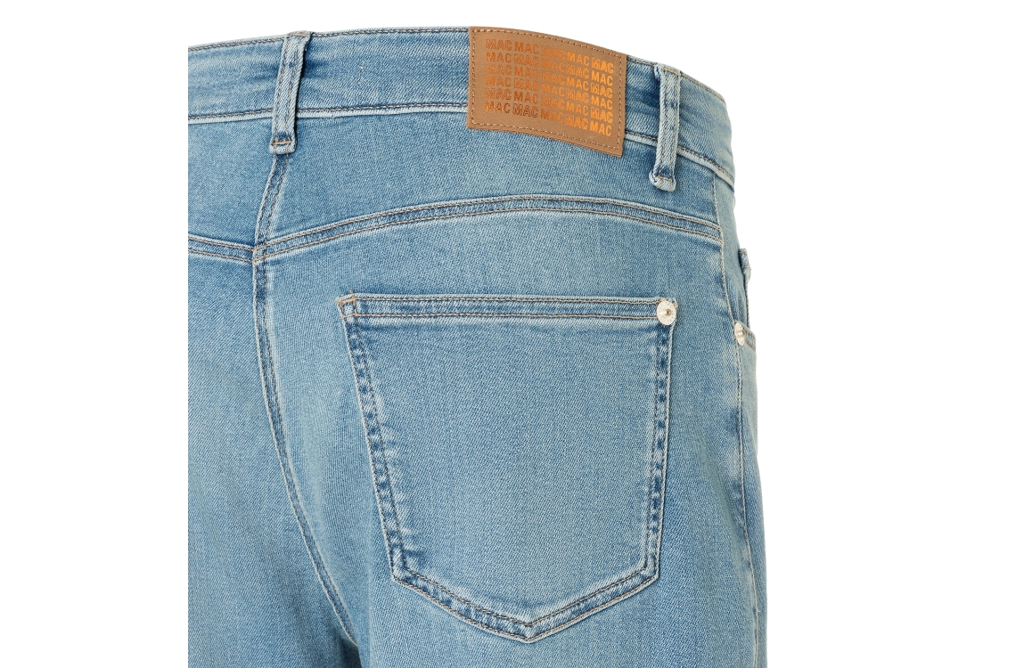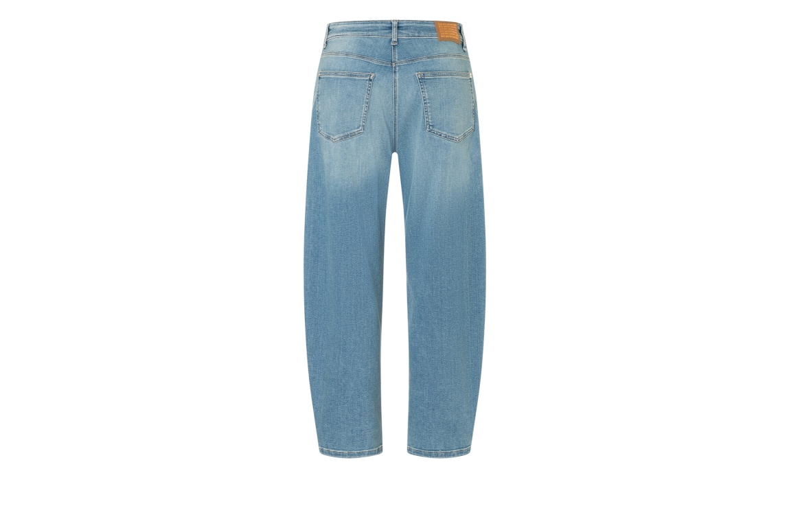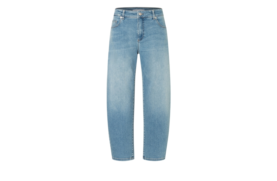 MAC DANNI D411 barrel jeans 0389L311090. Dit barrel fit model sluit door middel van een knoop en een rits. Deze blauwe denim jeans van Mac is voorzien van verschillende broekzakken en riemlusjes. Dit model bevat stretch.
