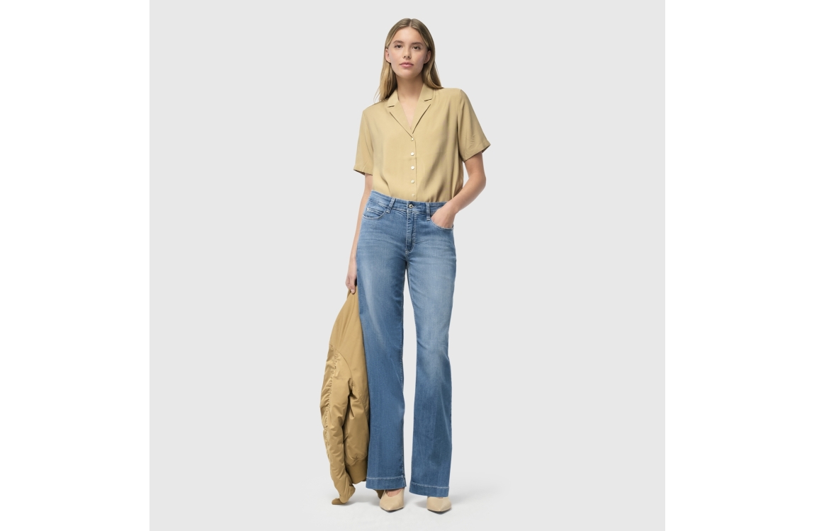 MAC DREAM WIDE D490 jeans 0351L544190. Dit wide leg model sluit door middel van een knoop en een rits. Deze blauwe denim jeans van Mac beschikt over verschillende broekzakken en riemlusjes. Dit model bevat stretch.
