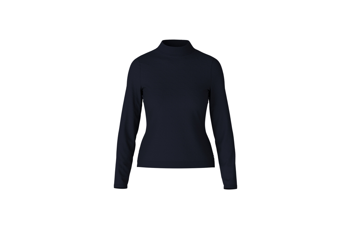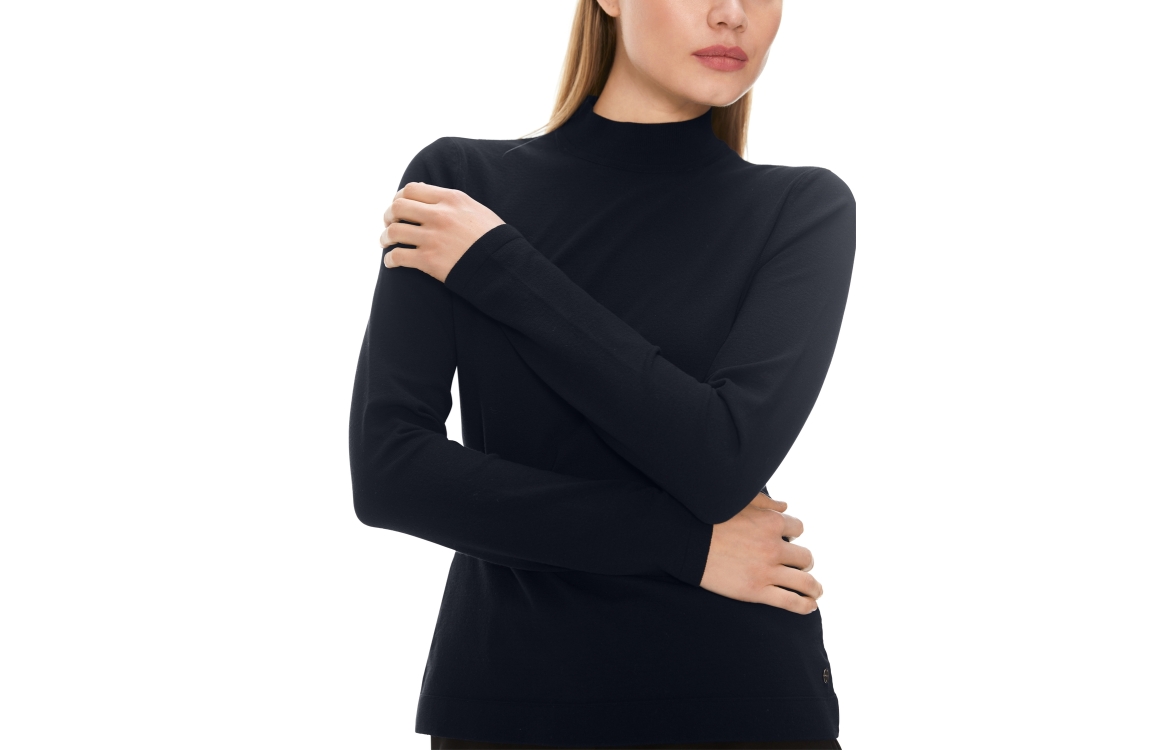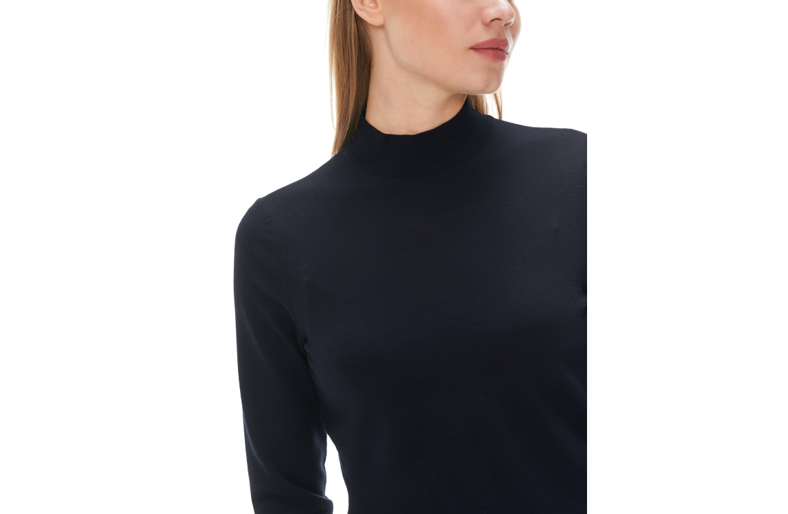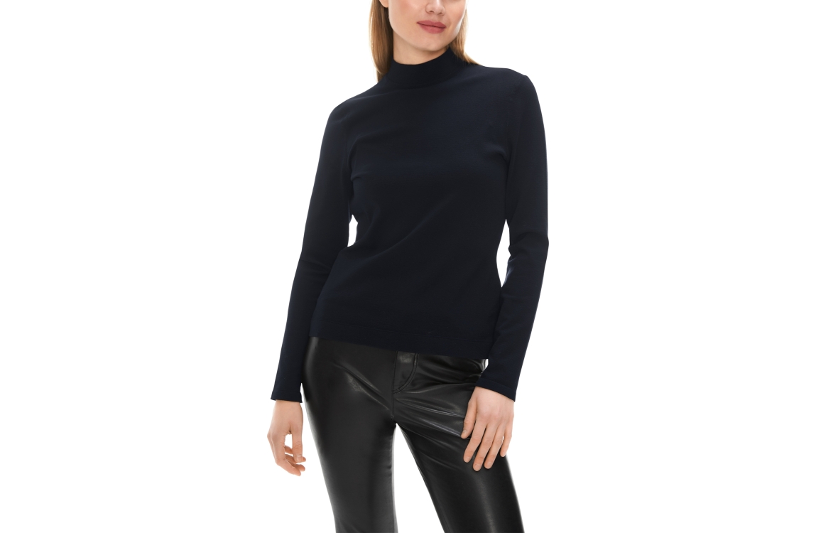 Marc Cain Additions pullover XA 41.10 M11. Dit model heeft een turtleneck en lange mouwen. Deze donkerblauwe pullover van Marc Cain is uitgevoerd in lichte stretch kwaliteit en heeft een aansluitende pasvorm.