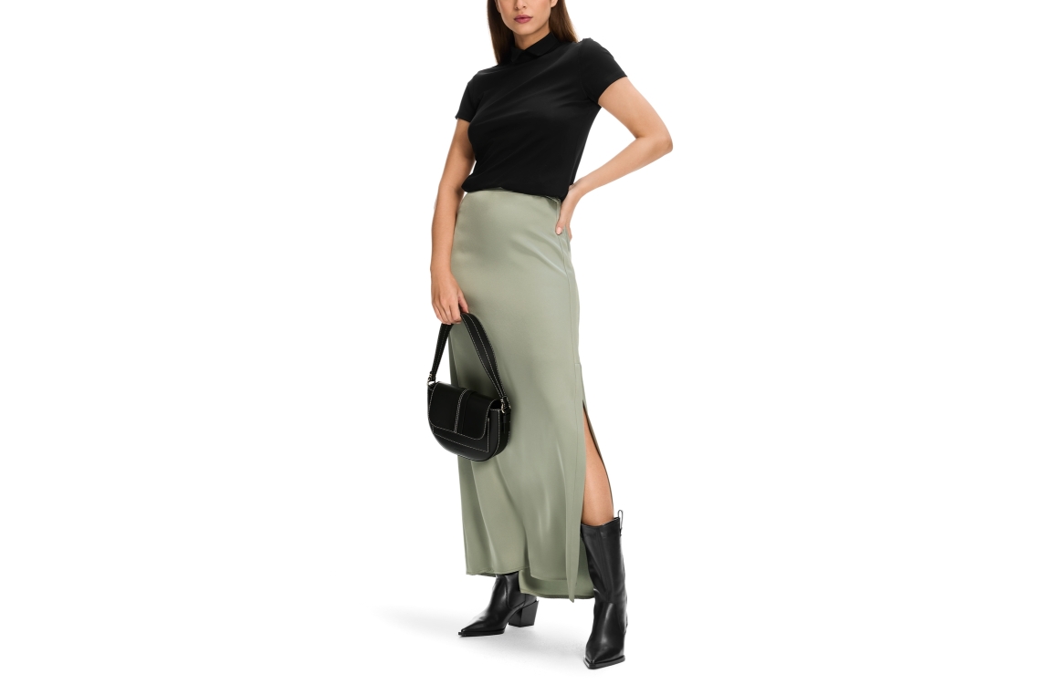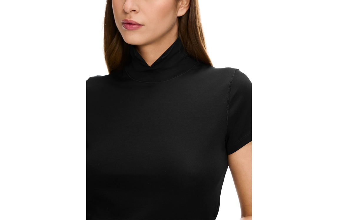 Marc Cain Additions T-shirt XA 48.55 J14. Dit rechtvallend model heeft een hoge mockneck en korte mouwen. Deze zwarte T-shirt van Marc Cain is afgewerkt met een split in de hoge hals en is uitgevoerd in stretch kwaliteit.