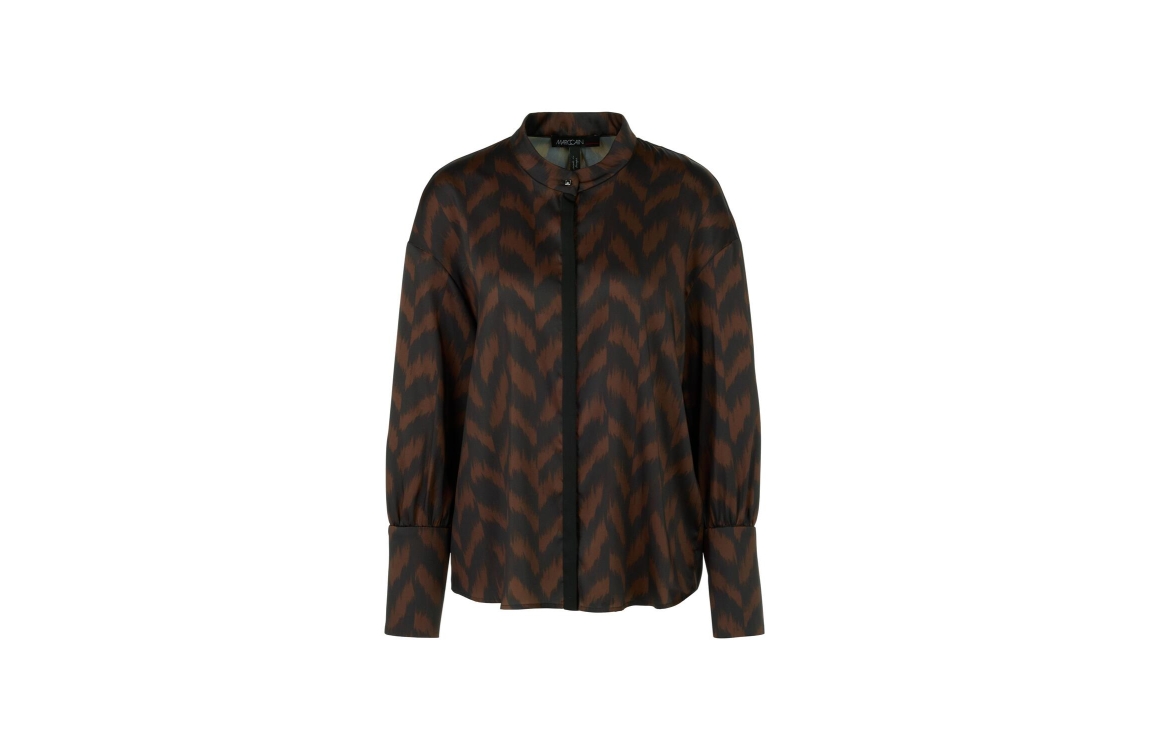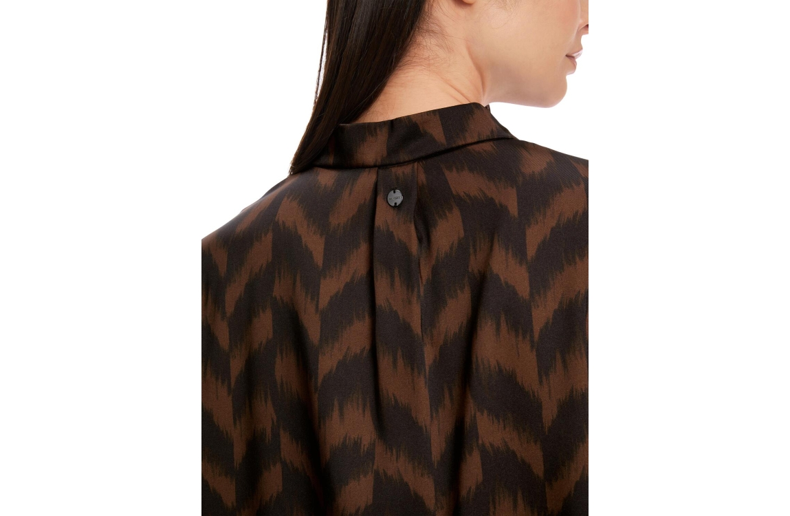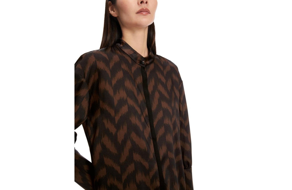 Marc Cain Collections blouse XC 51.31 W09. Dit rechtvallend model heeft een ronde hals met een decoratieve knoop en lange mouwen. Deze donkerbruine blouse van Marc Cain sluit aan de voorzijde door middel van knopen en is all-over bewerkt met een grafische print in verschillende tinten.