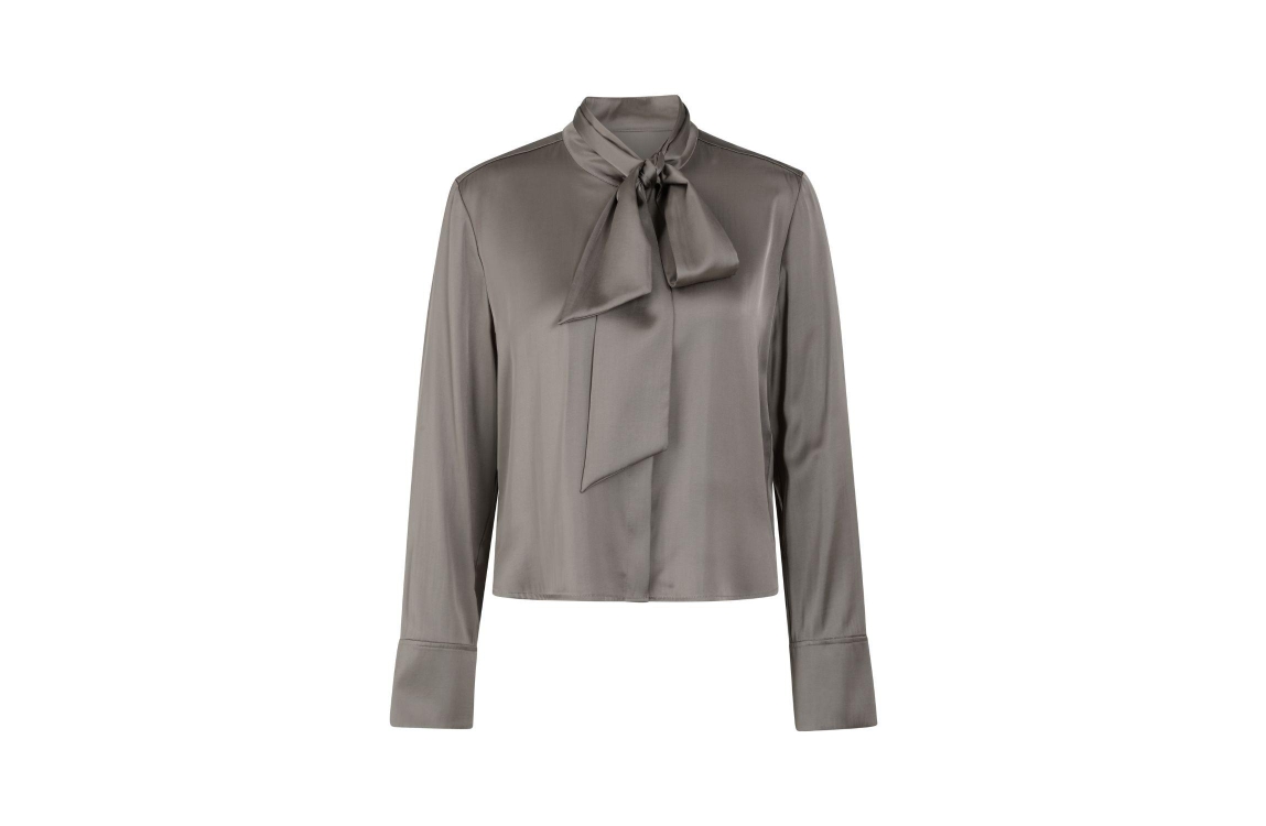 MarcCain Collections Bluse 836 Soft charcoal. Dit rechtvallende model is voorzien van een ronde hals met een afneembaar strik en heeft lange mouwen. Deze grijze satijnen look blouse van MarcCain sluit door middel van knopen.
