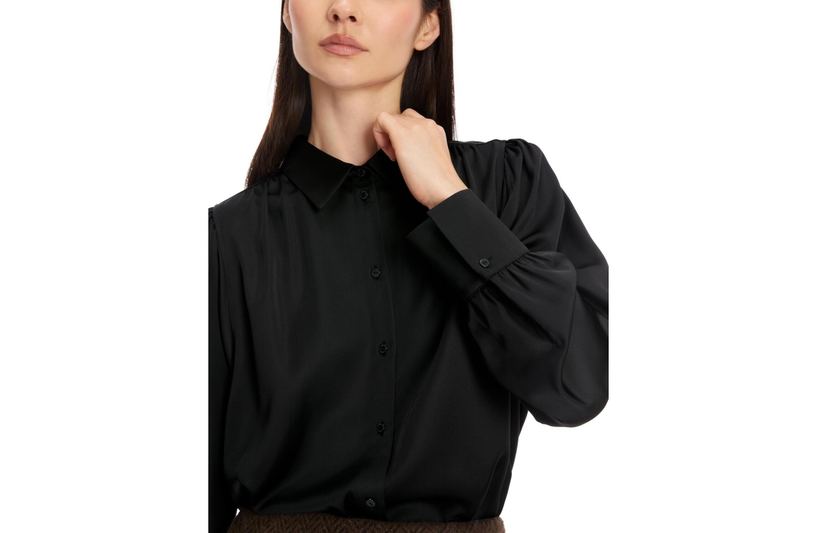 Marc Cain Collections blouse XC 51.37 W85. Dit rechtvallend model heeft een kraag en lange mouwen. Deze zwarte blouse van Marc Cain sluit aan de voorzijde door middel van knopen en heeft een all-over satijnen look. Dit model is afgewerkt met manchetknopen en plooidetails op de schouders en hals.