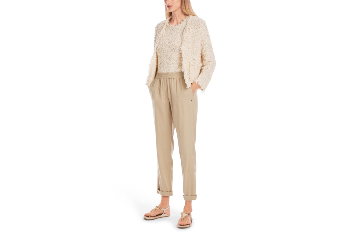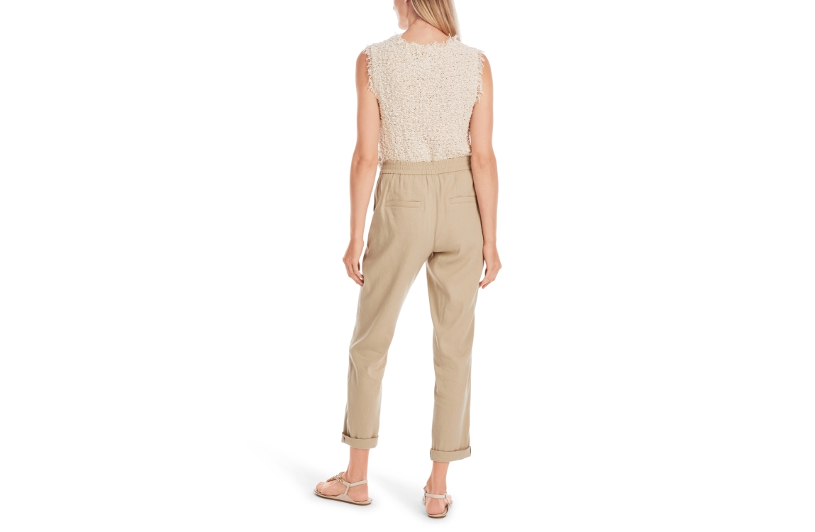 Marc Cain Collections broek YC-81.59-W70. Dit relaxed fit sluit door middel van een elastische boord en beschikt over twee steekzakken en paspelzakken. Deze beige broek van Marc Cain is afgewerkt met een omgeslagen zoom.