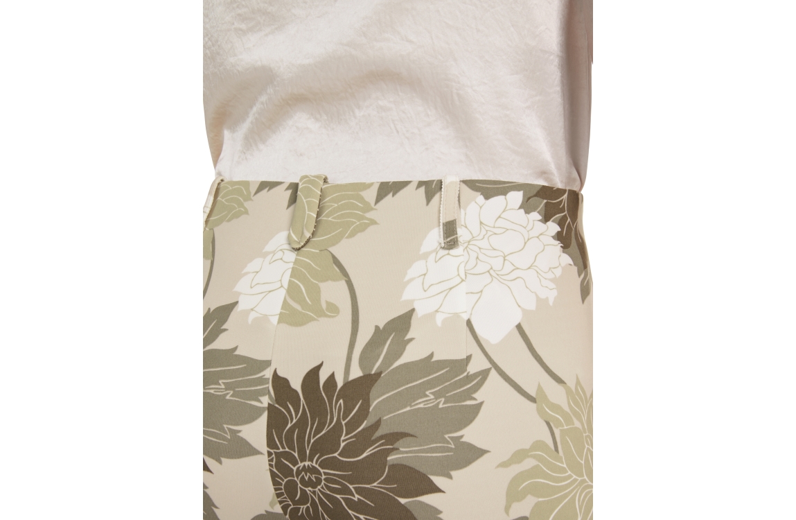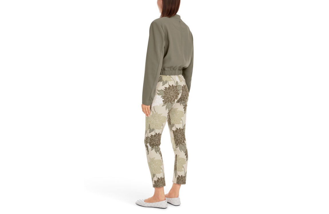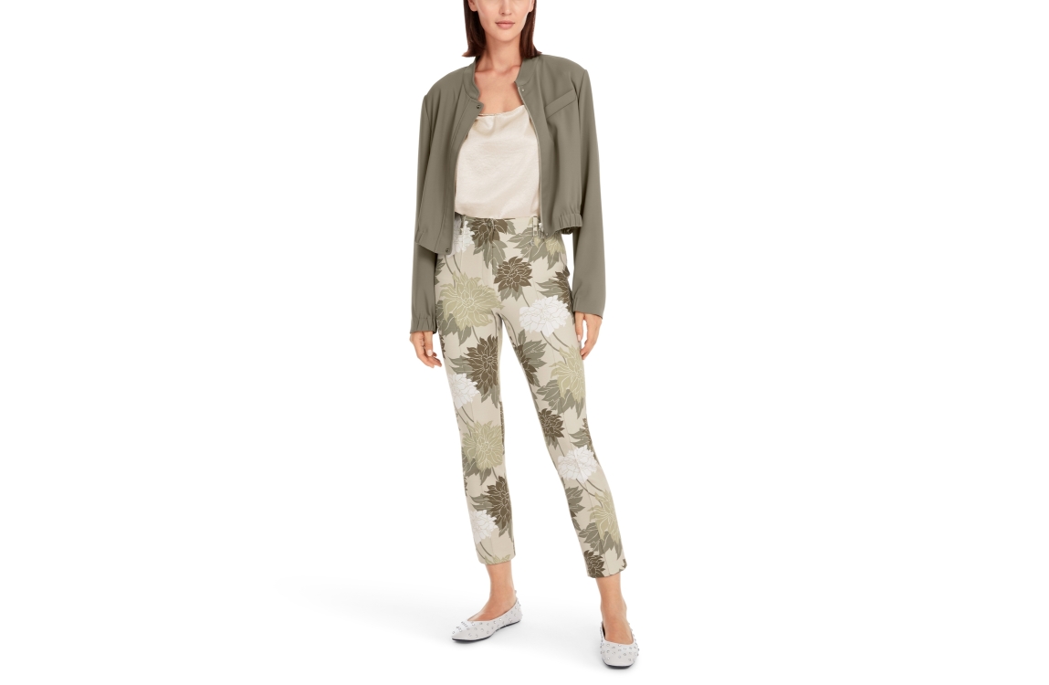 Marc Cain Collections broek Sydney YC.81.11 J04. Dit regular fit model sluit door middel van een knoop- en ritssluiting en is voorzien van ceintuurlussen. Deze groene broek van Marc Cain Collections is all-over bewerkt met een grafische bloemenprint in verschillende kleuren en is afgewerkt met plooidetails op de voorzijde van de broek.