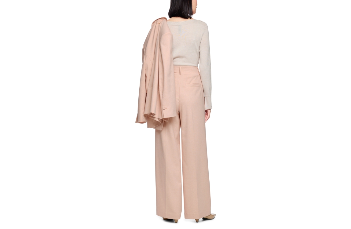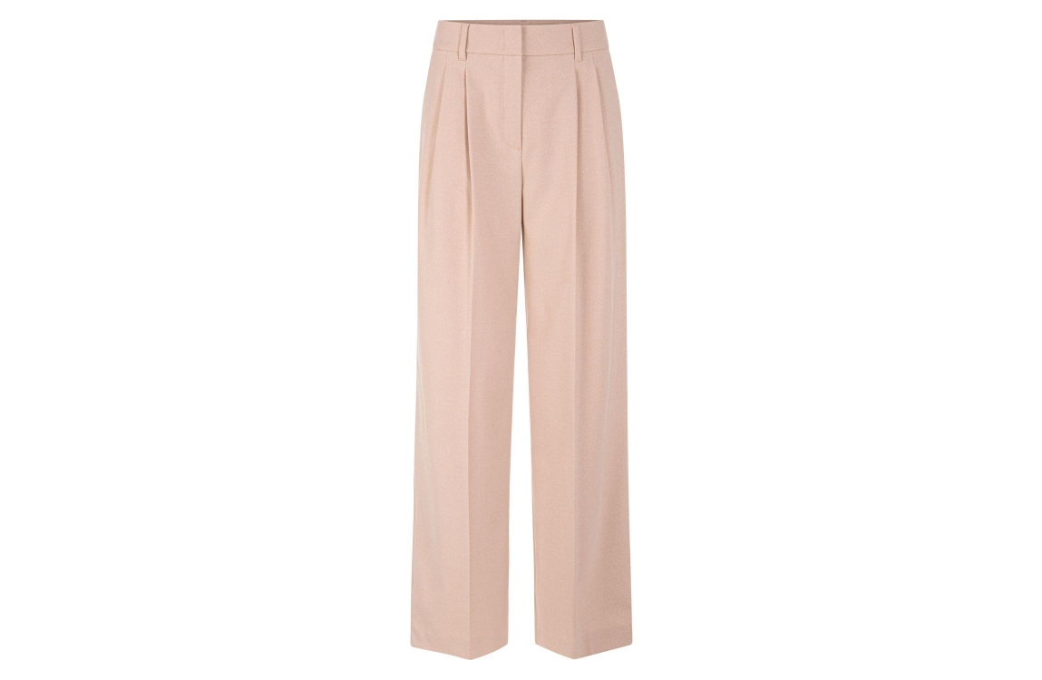 MarcCain Collections Hose WICHITA 217 Peach beige. Dit wijdvallende model sluit door middel van een knoop en rits. Deze roze pantalon van MarcCain is bewerkt met steekzakken en paspelzakken op de achterzijde. Dit model is voorzien van een hoge taille, bandplooien en is bewerkt met een subtiele glitter.