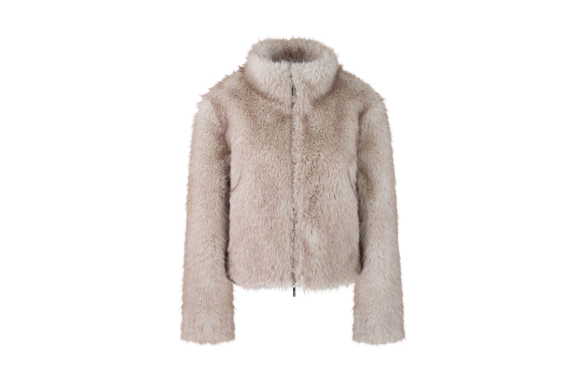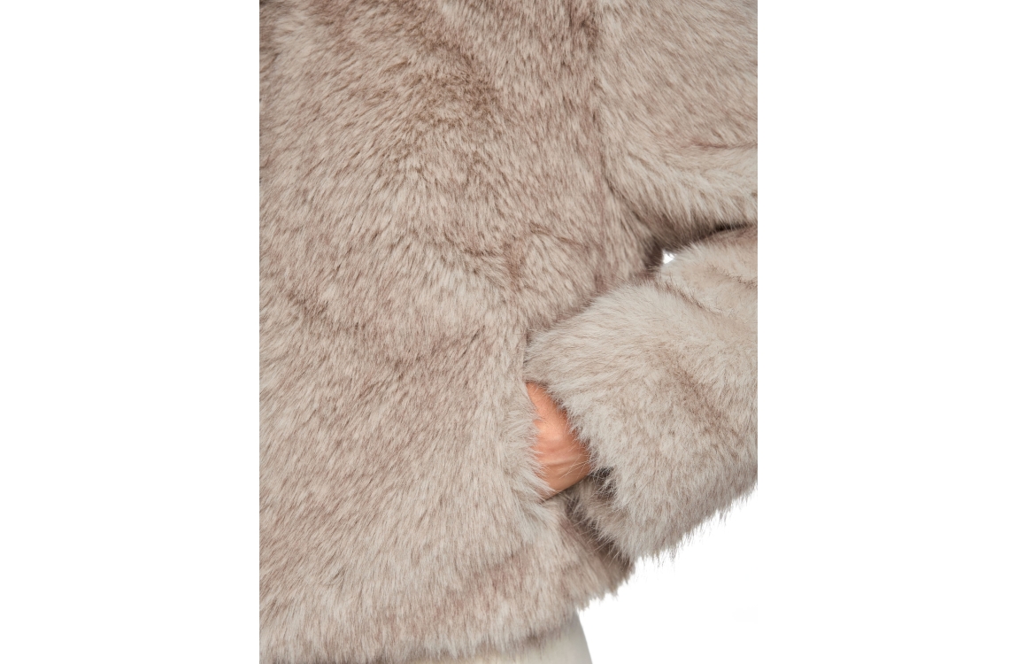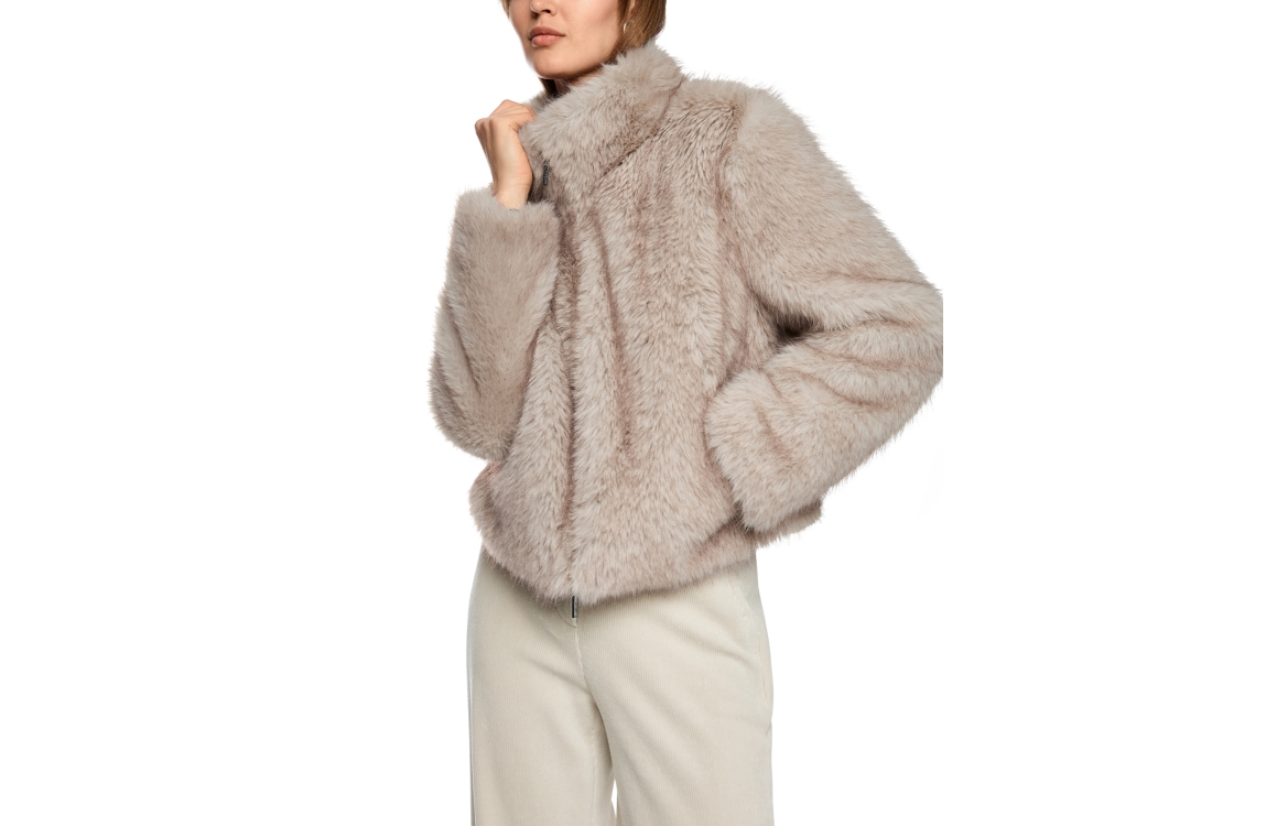 MarcCain Collections Outdoor-Jacke 182 Smoke. Dit rechtvallende model is voorzien van een opstaande kraag en heeft lange mouwen. Deze beige kleurige jas van MarcCain sluit aan de voorzijde door middel van een rits en heeft twee steekzakken.