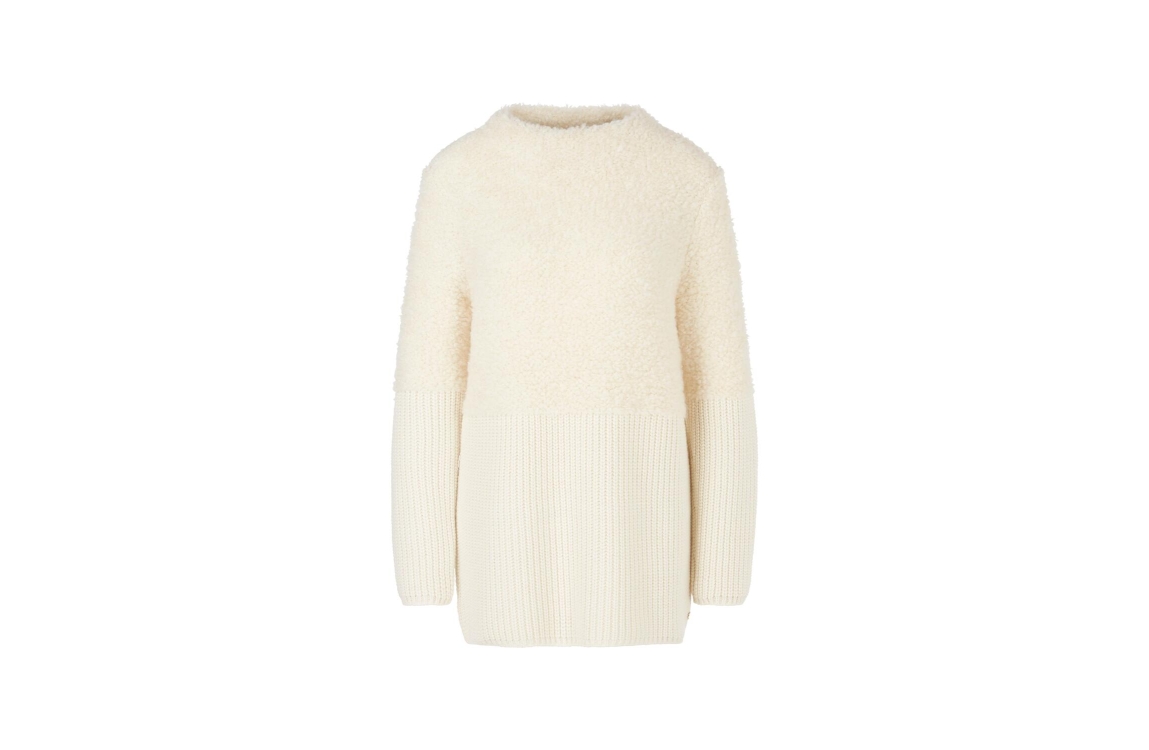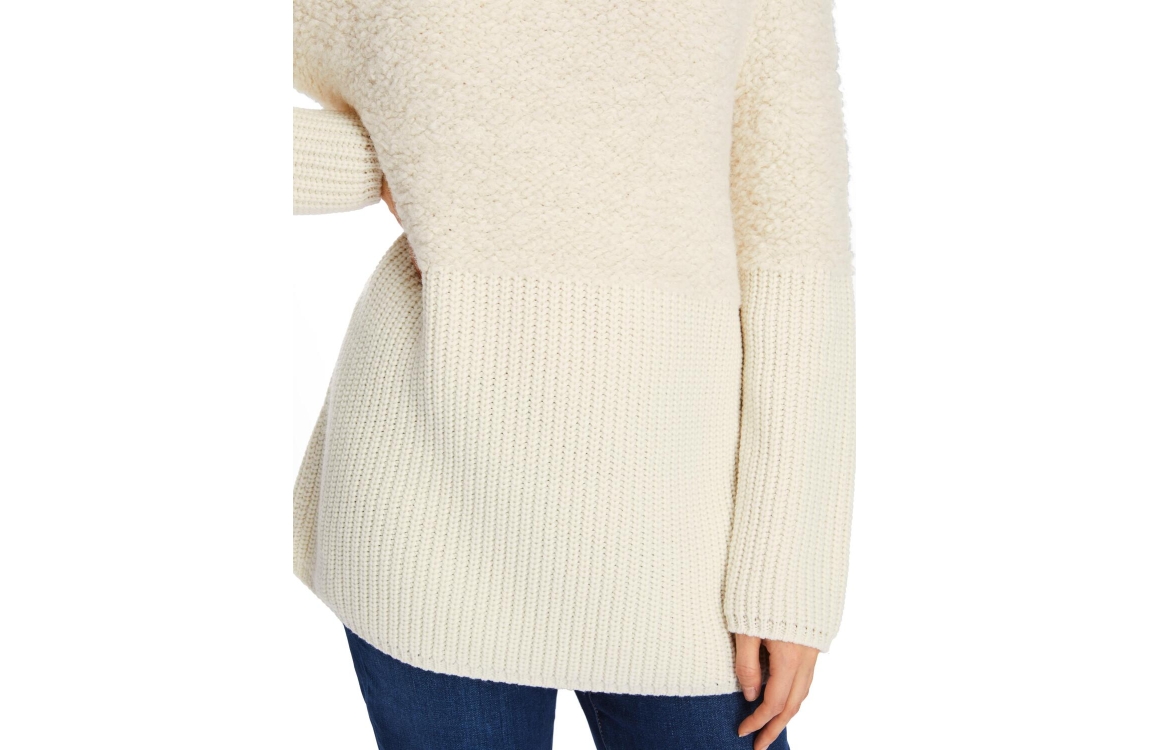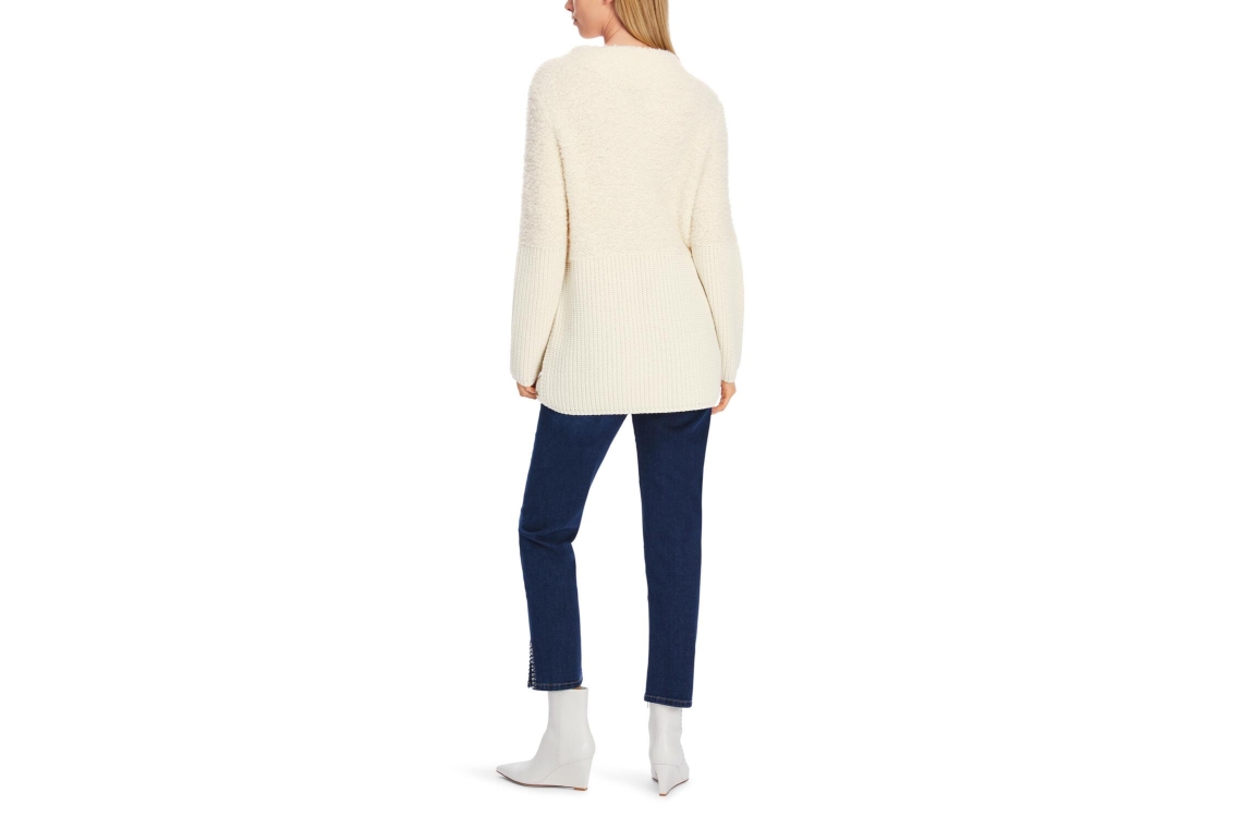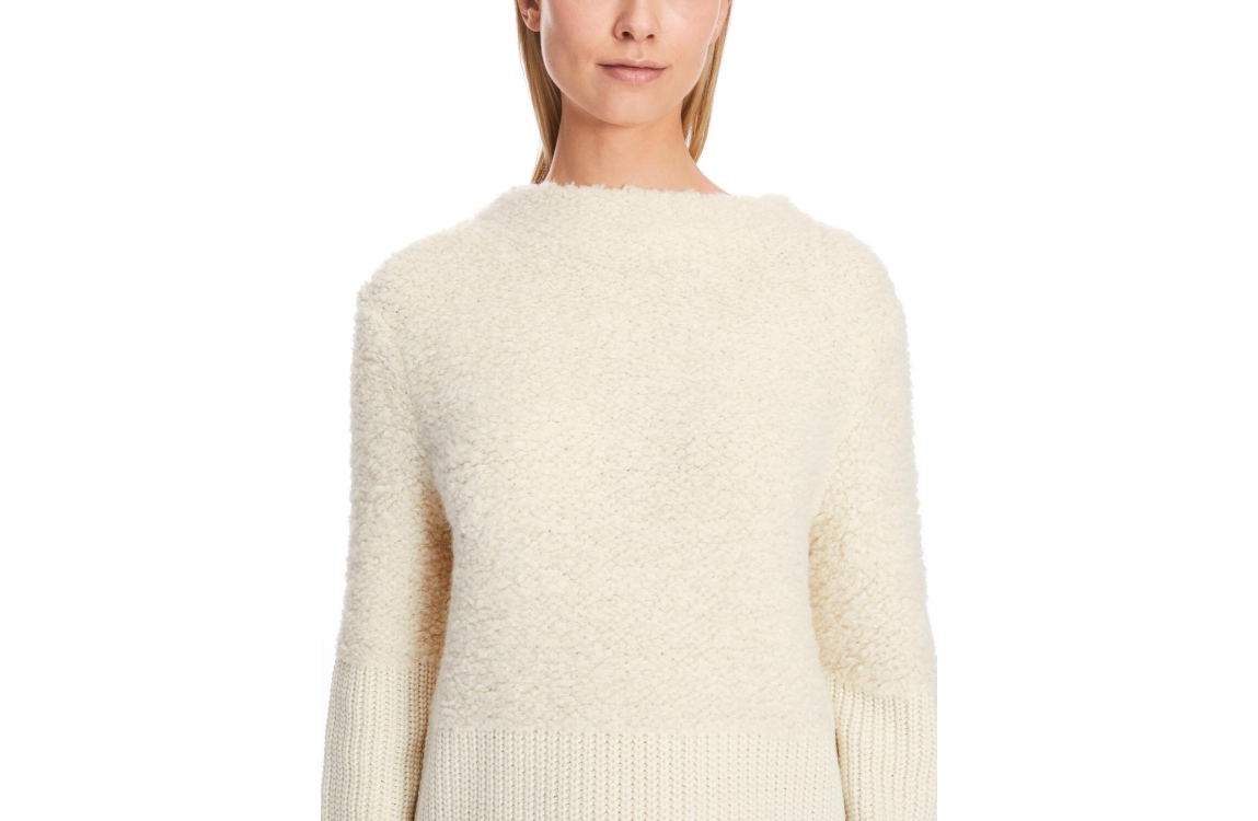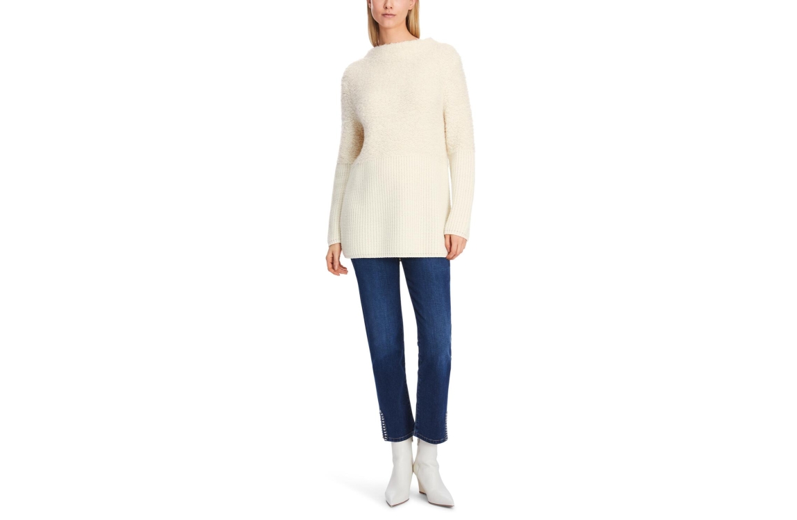 Marc Cain Collections pullover XC 41.11 M14. Dit rechtvallend model heeft een turtleneck en lange mouwen. Deze off/white trui van Marc Cain Collections is aan de bovenzijde uitgevoerd in teddystof en de onderzijde is uitgevoerd in een gebreide kwaliteit.