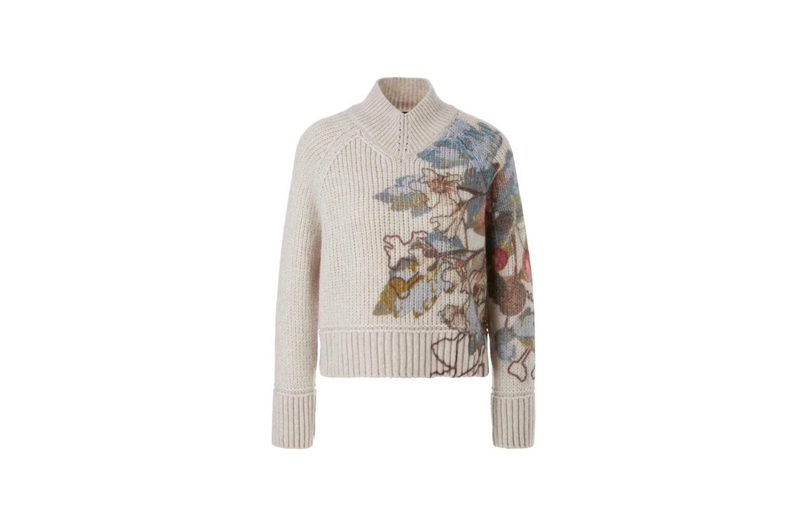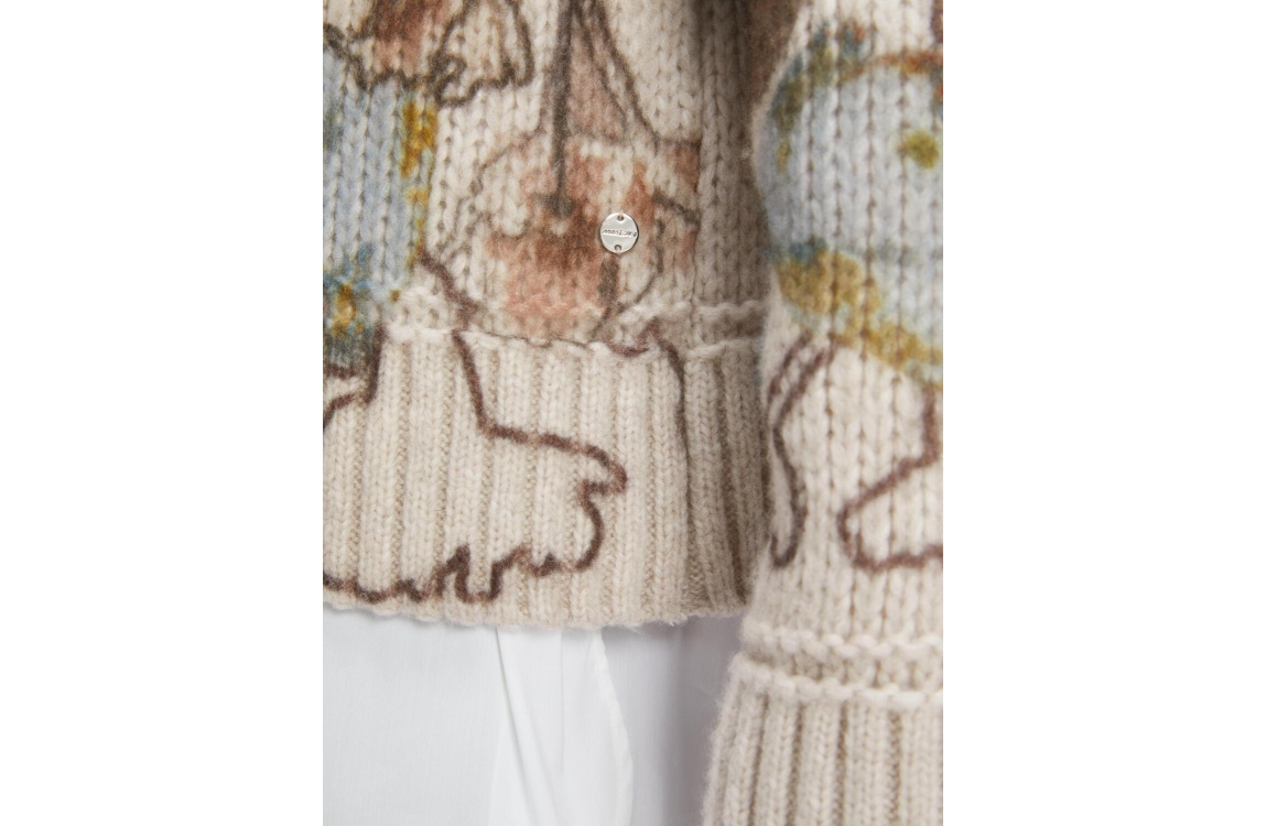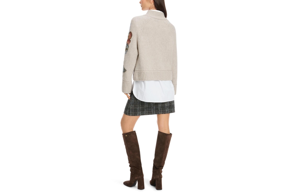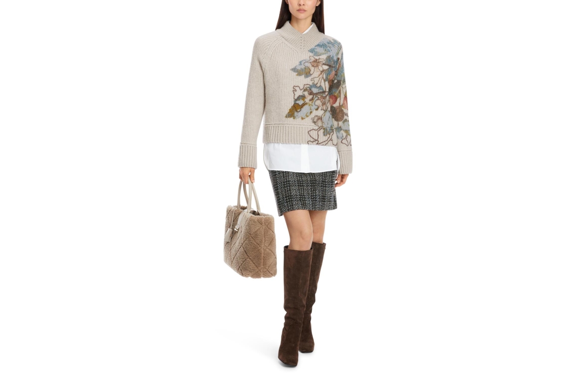 Marc Cain Collections trui XC 41.46 M18. Dit rechtvallend model heeft een hoge V-hals en lange mouwen. Deze grijze trui van Marc Cain is aan de linkerzijde bewerkt met een bloemenprint in verschillende kleuren en is afgewerkt met geribde stoffen boorden.