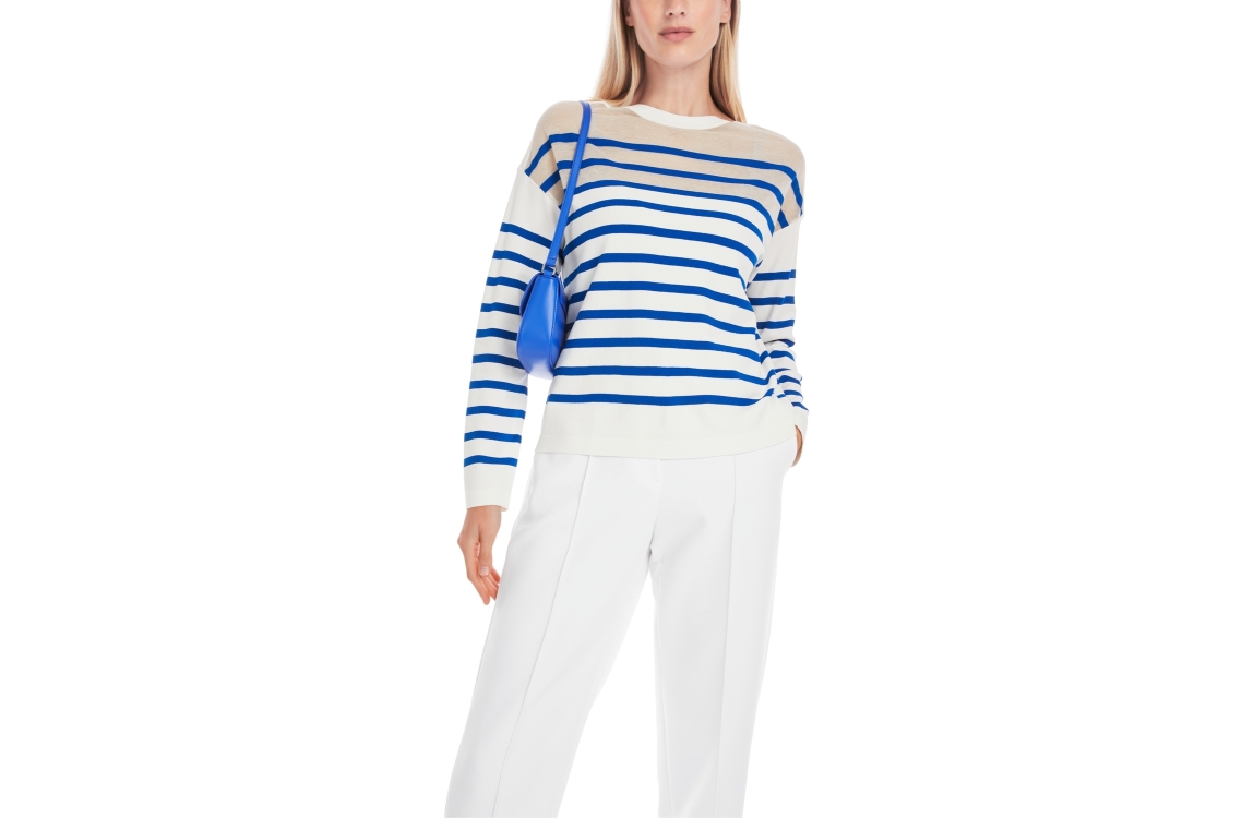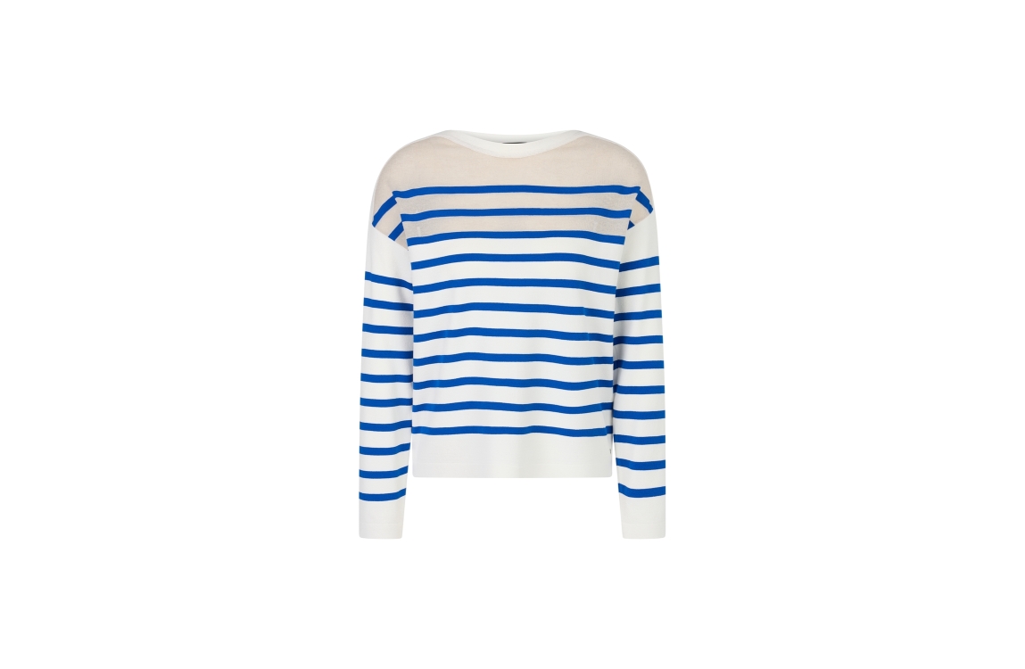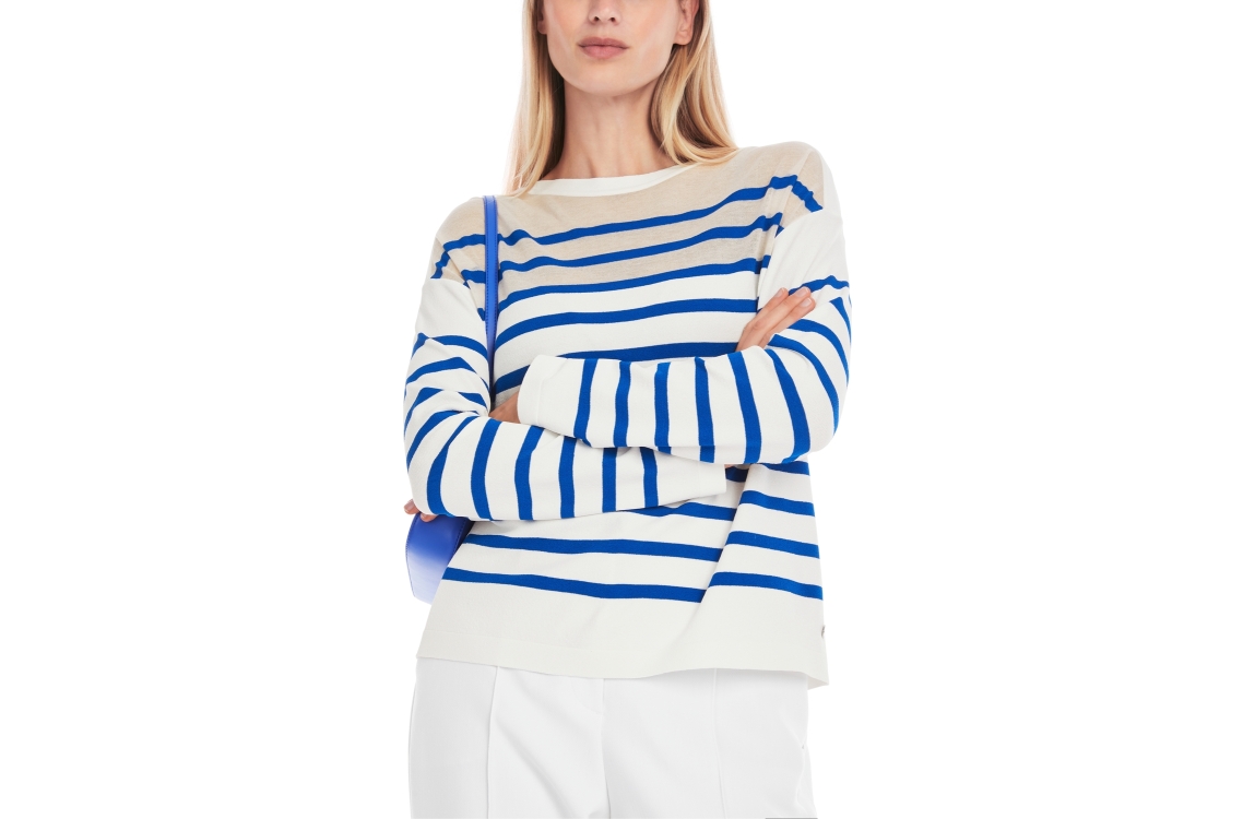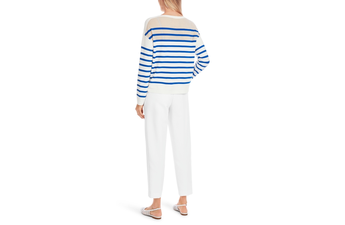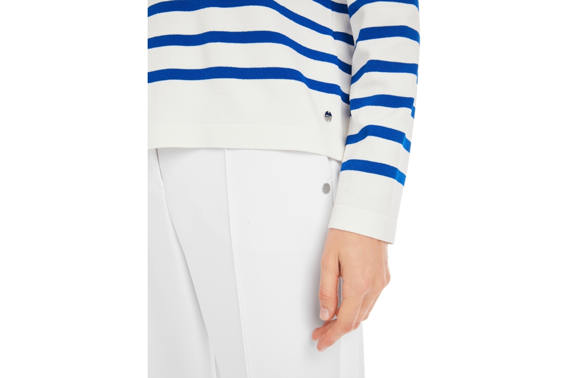 Marc Cain Collections pullover YC 41.39 M42. Dit rechtvallend model heeft een hoge halslijn en lange mouwen. Deze witte pullover van Marc Cain is all-over bewerkt met een blauwe streepprint en is aan de bovenzijde bewerkt met een beige tint.