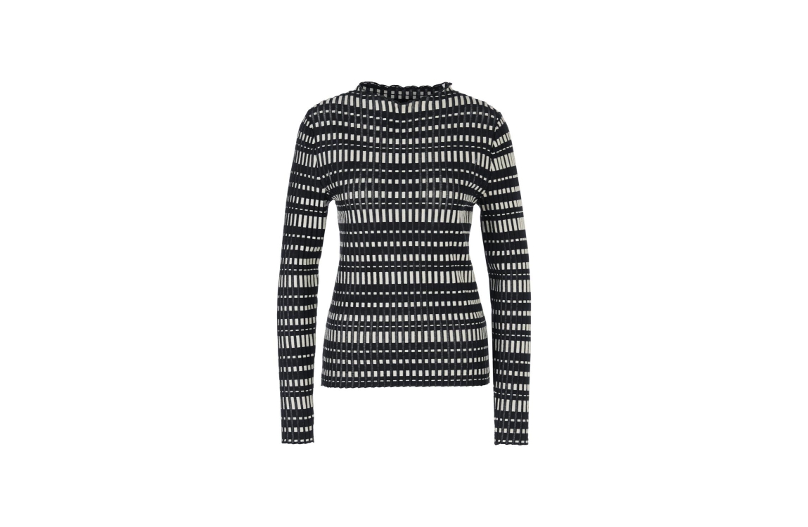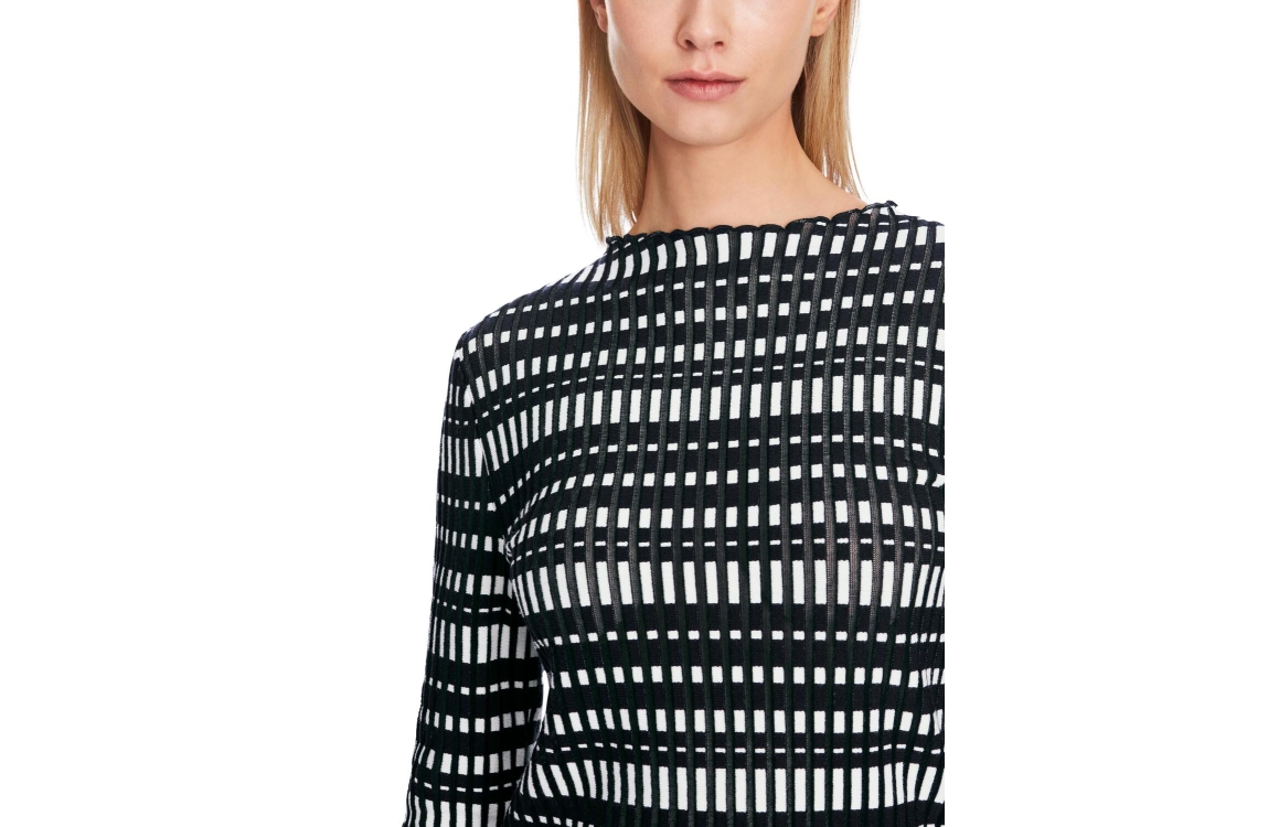 MarcCain top XC 41.13 M17. Dit aangesloten model is voorzien van een opstaande kraag en heeft lange mouwen. Deze donkerblauwe top van MarcCain is bewerkt met verticale strepen en is uitgevoerd in een semitransparante kwaliteit.