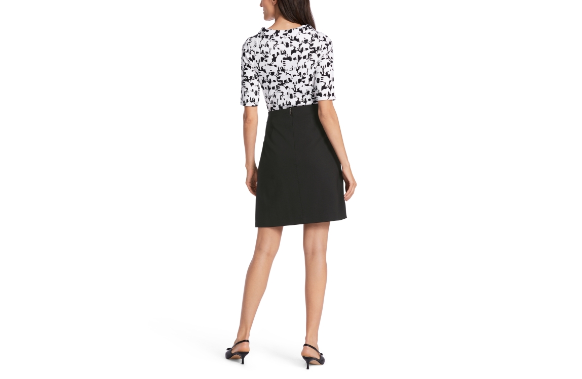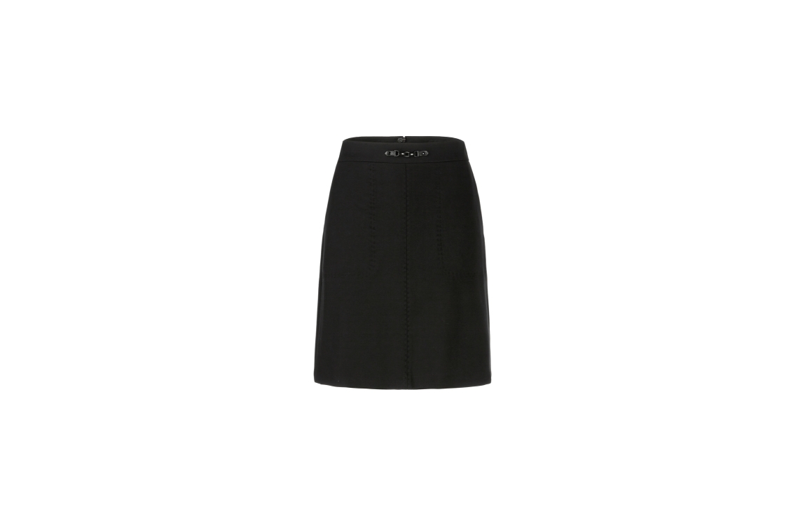 MarcCain Collections rok WC71.16J24. Dit rechtvallende model sluit met een rits en een blinde knoop. Deze zwarte rok van MarcCain Additions heeft steekzakken die met een borduursteek is afgewerkt, heeft een decoratieve gesp middenvoor en is gevoerd.