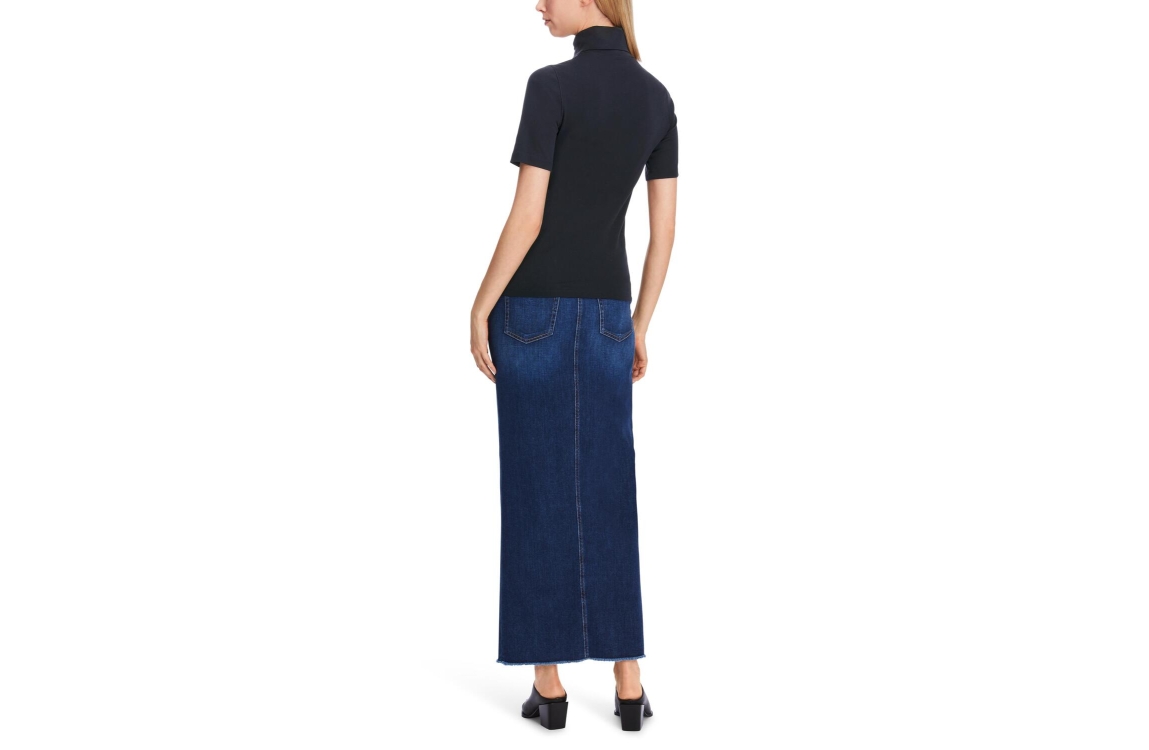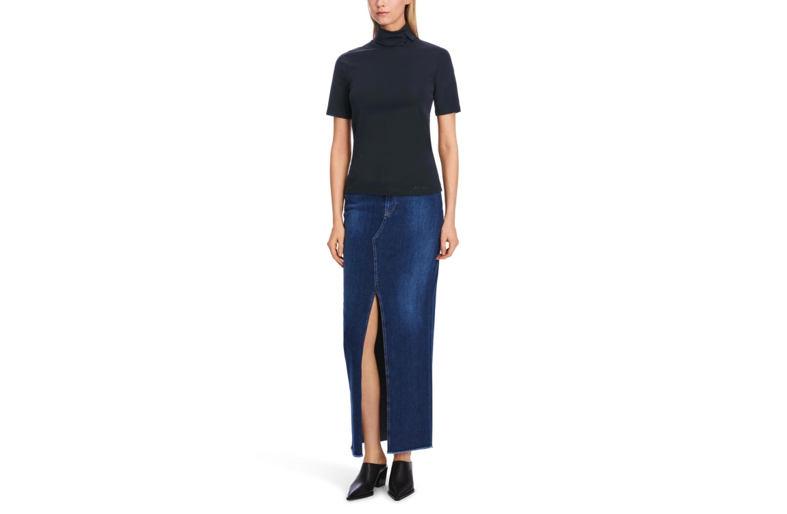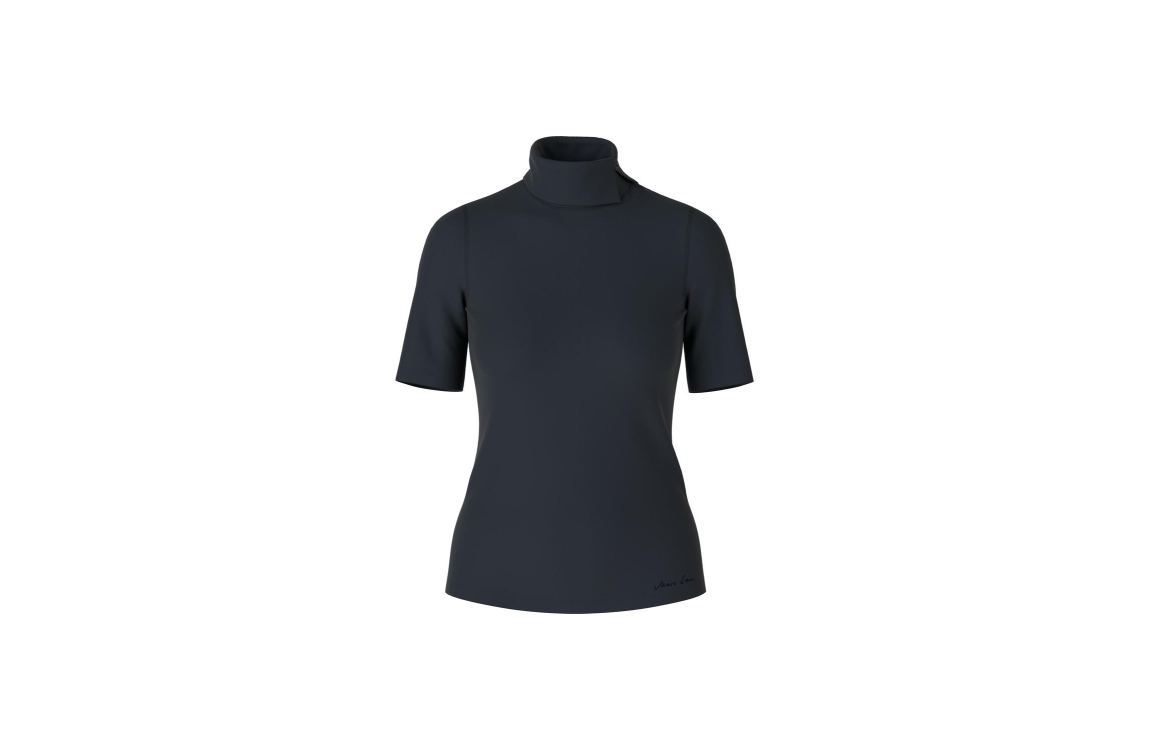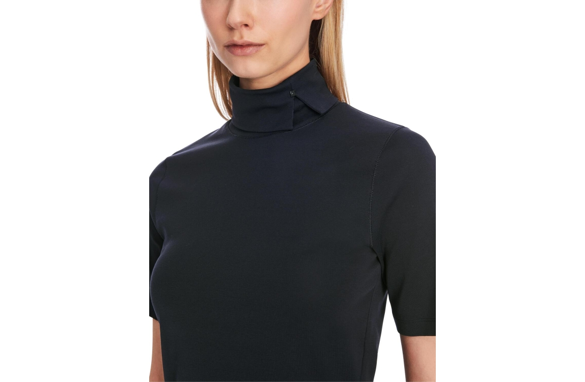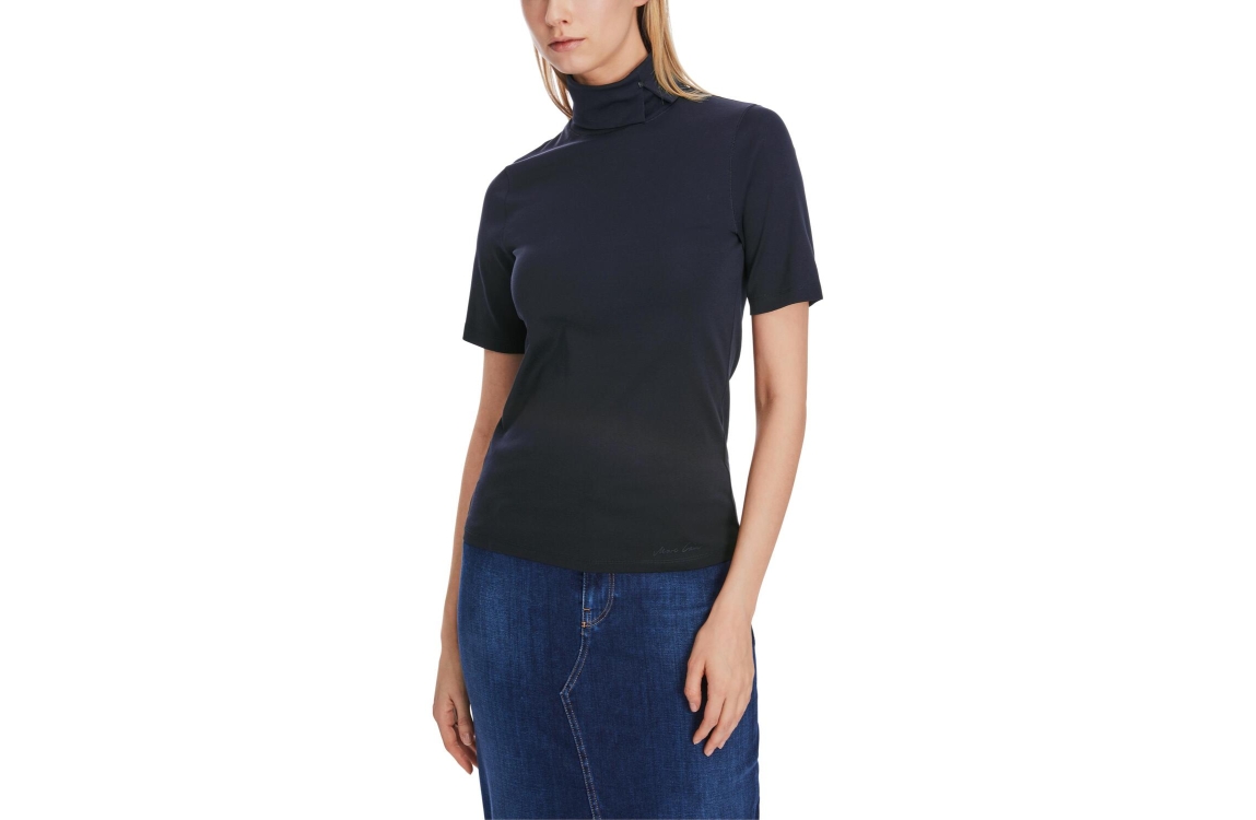 Marc Cain Collections top XC48.18J14. Dit rechtvallend model is voorzien van een rolkraag afgewerkt met een split detail en een decoratieve sierlijke knoop en heeft korte mouwen. Deze donkerblauwe top van Marc Cain is bewerkt met het logo op de zoom aan de voorzijde.