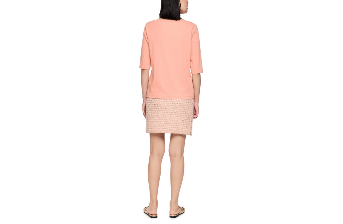 Marc Cain Collections T-shirt AC 48.16 J15. Dit rechtvallend model is voorzien van een ronde hals bewerkt met goudkleurige boord en heeft korte mouwen. Deze perzikkleurige T-shirt van Marc Cain is afgewerkt met logo aan de onderzijde.
