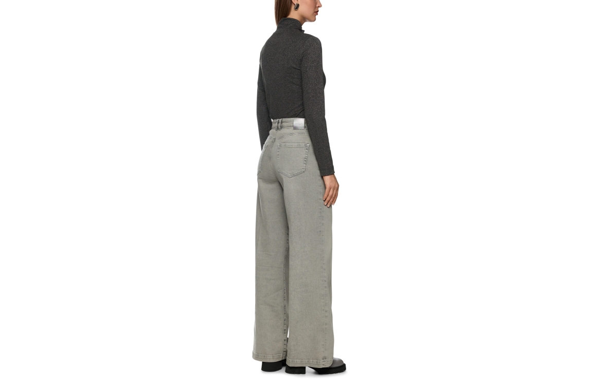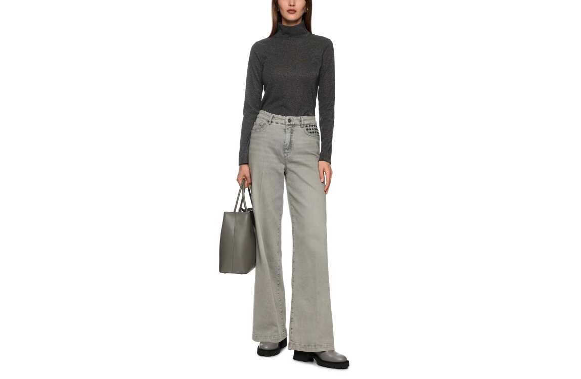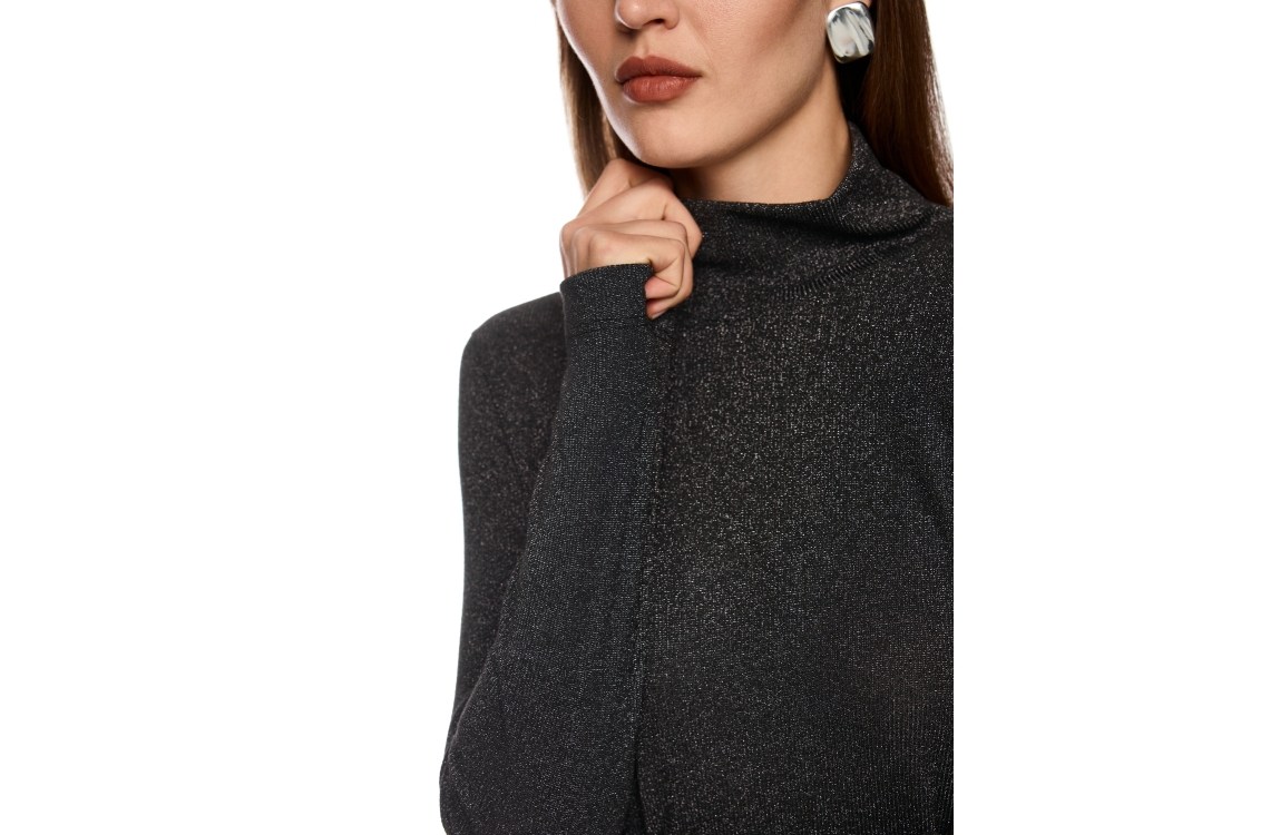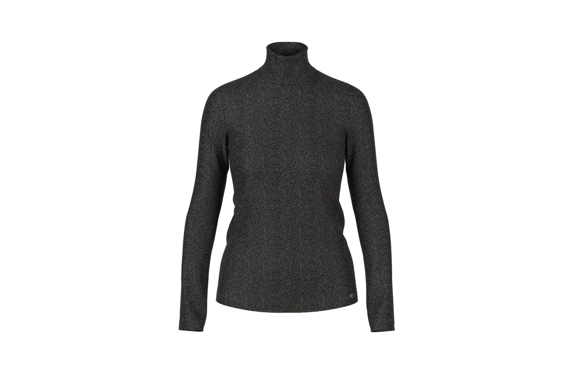 MarcCain Collections T-Shirt 842 Flannel. Dit aangesloten model is voorzien van een col en heeft lange mouwen. Deze zwarte top van Marc Cain is is geribd uitgevoerd en bewerkt met glitter.