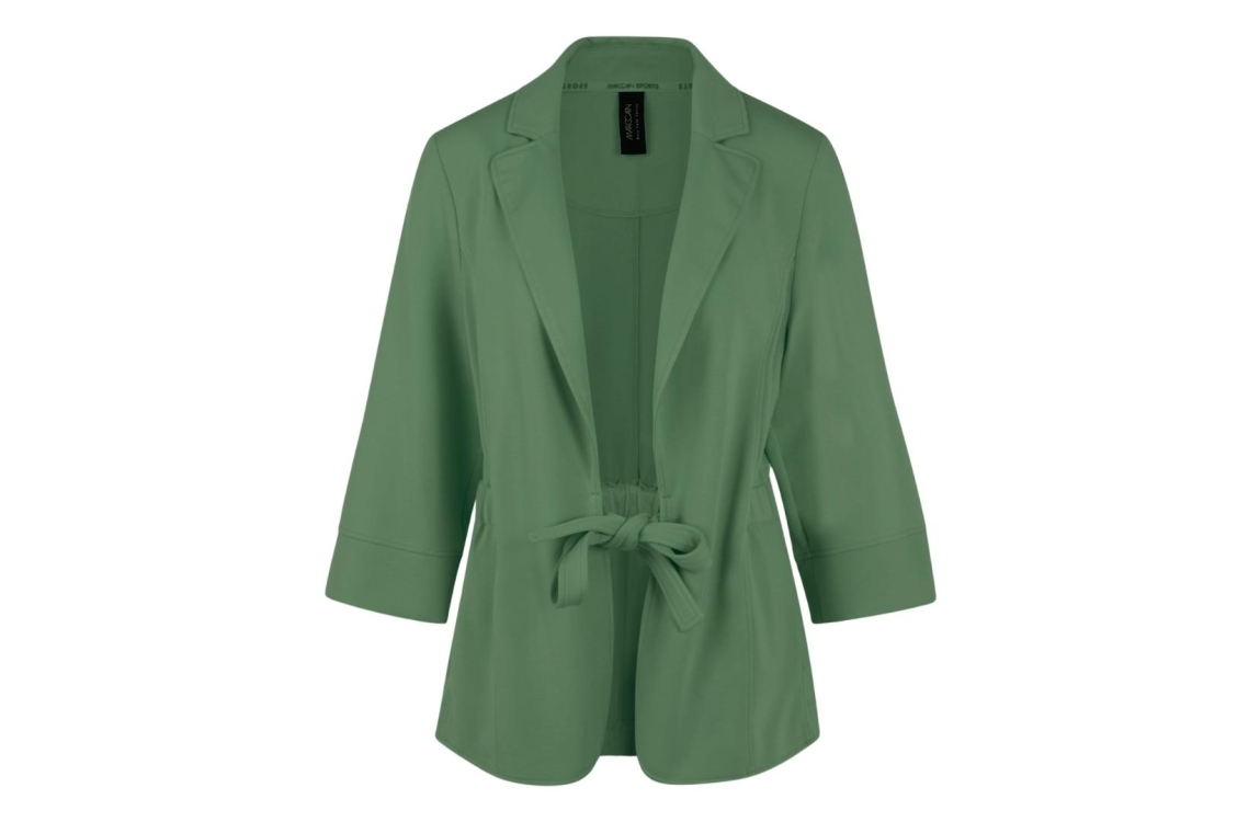 MarcCain Sports Blazer 574 Olivine. Dit aangesloten model heeft een kraag en wijde driekwart mouwen. Deze groene blazer van MarcCain sluit door middel van een knoop en tailleband. Dit model is afgewerkt met plooien in de taille en zakken aan de voorzijde.