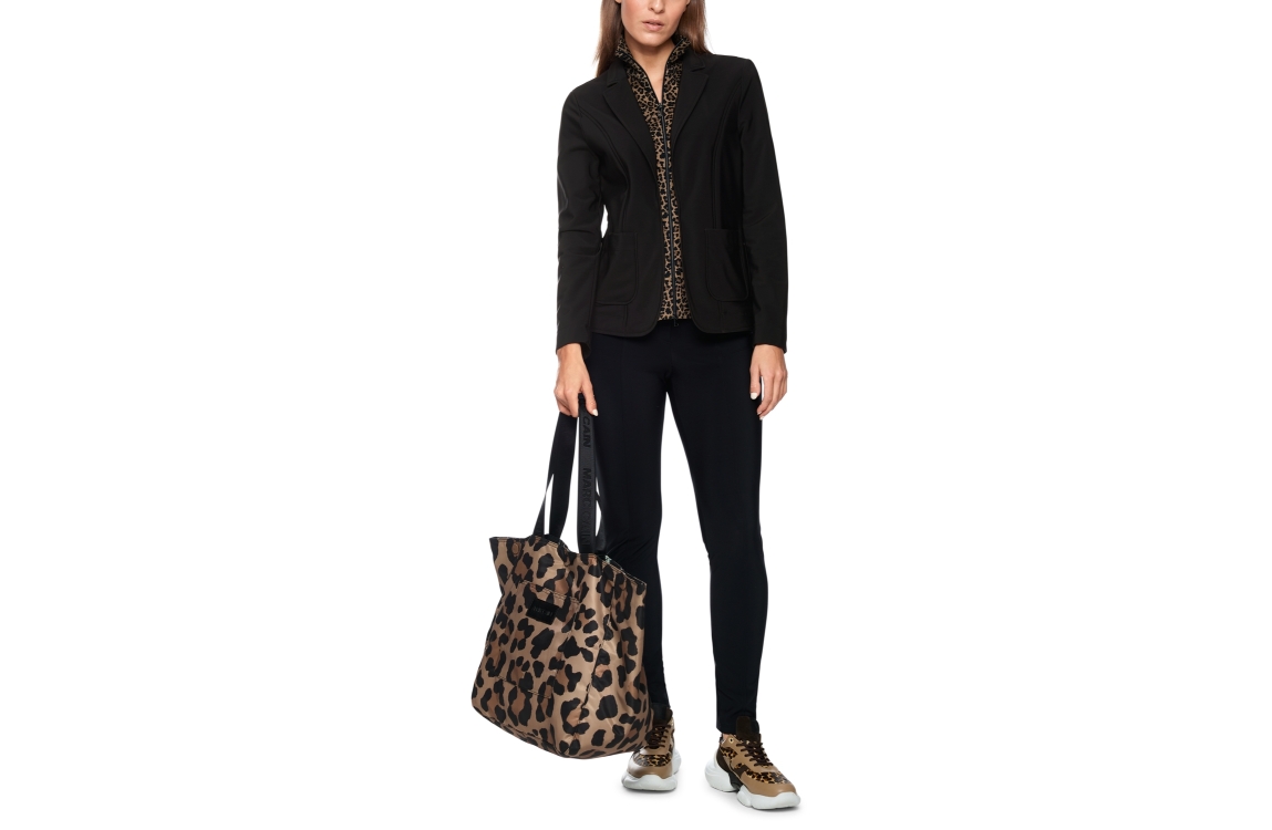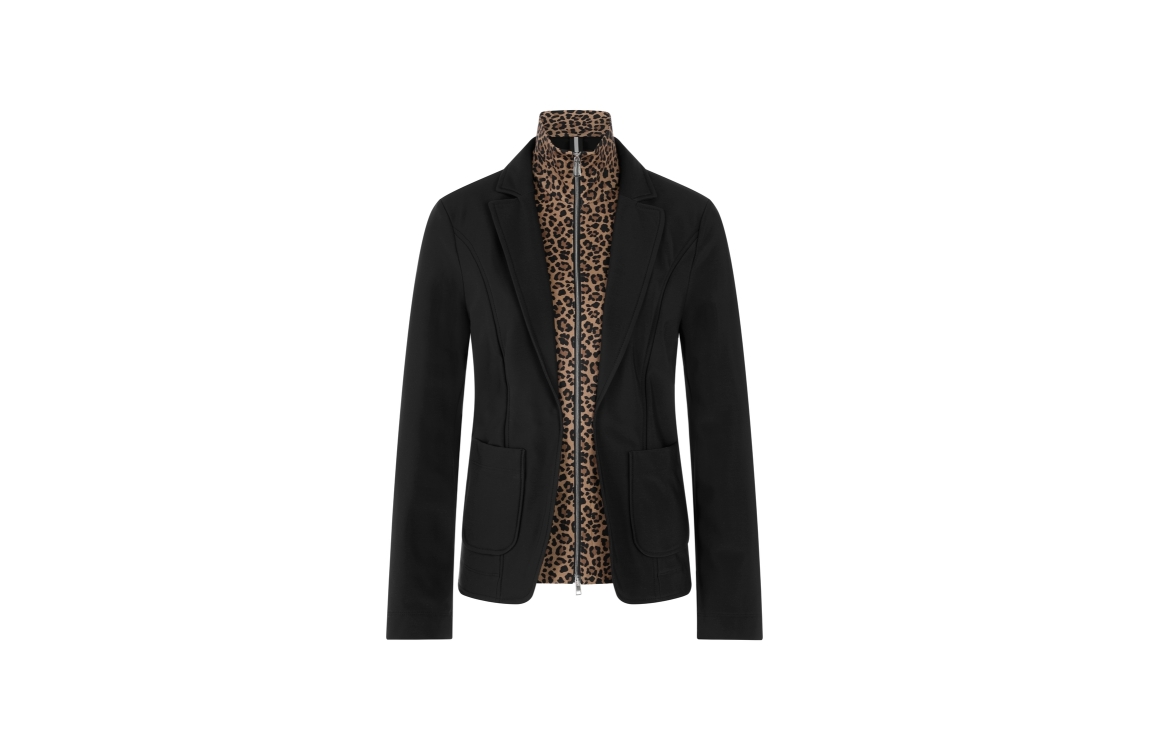 MarcCain Sports Blazer ZS 34.11 J60. Dit rechtvallende model heeft een kraag en lange mouwen. Deze navy kleurige blazer van MarcCain sluit door middel van een rits en is voorzien van een inzet met panterprint. Deze sportieve blazer is bewerkt met openstaande steekzakken.