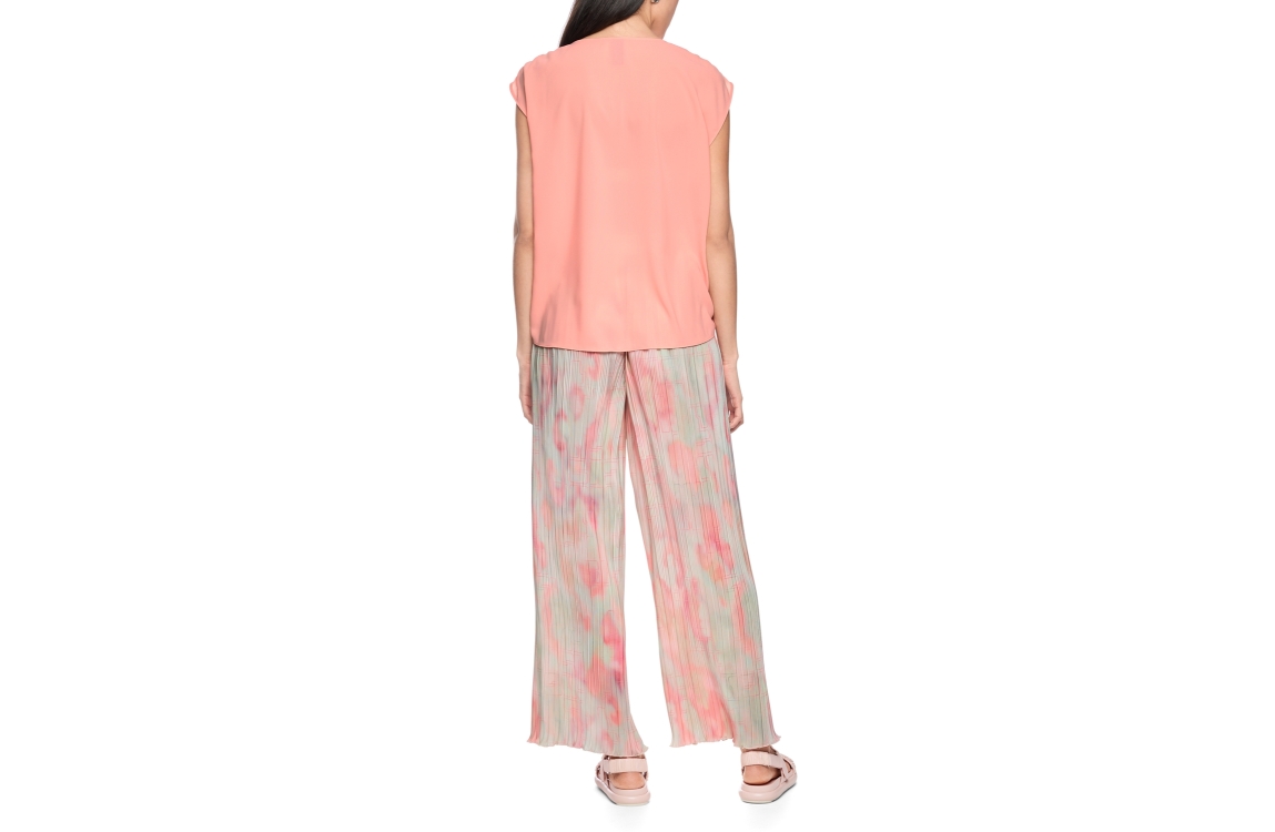 MarcCain Sports Bluse 231 Candelight peach. Dit soepelvallende model is voorzien van een v-hals en is mouwloos. Deze roze blouse van MarcCain is afgewerkt met plooien op de schouders en een chique plooi aan de voorkant.