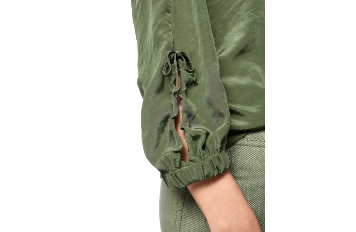 MarcCain Sports Blusenshirt 574 Olivine. Dit soepelvallende model is voorzien een ronde hals en heeft driekwart mouwen. Deze groene blouse van MarcCain is bij de mouwen afgewerkt met een strikdetail en een elastische boord.