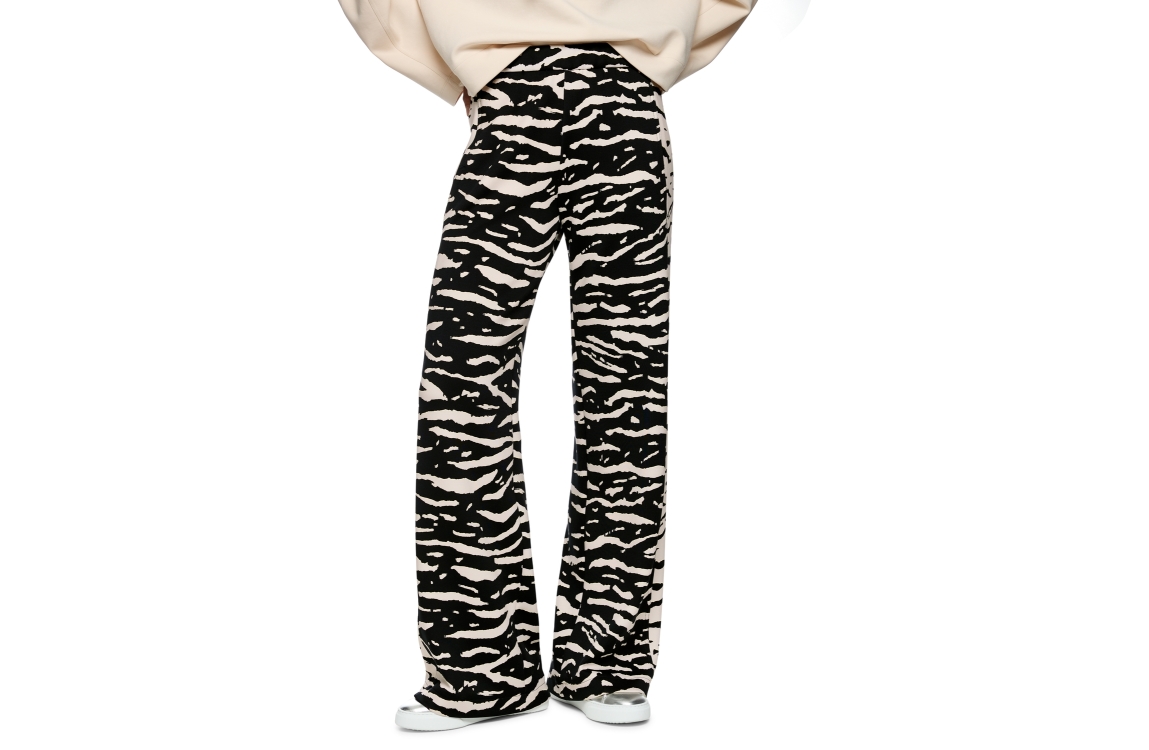 Marc Cain Sports broek AS 81.13 J03. Dit wide leg model sluit door middel van een elastische boord en is voorzien van twee steekzakken aan de voorzijde. Deze zwarte/offwhite broek van Marc Cain Sports is bewerkt met een zebraprint en is afgewerkt met lichtgele details.