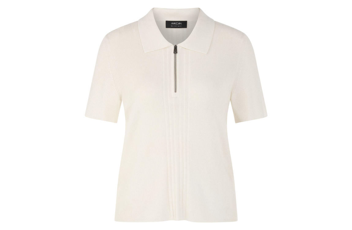 MarcCain Sports Poloshirt 110 Off white. Dit rechtvallende model heeft een kraag en korte mouwen. Dit witte poloshirt van Marc Cain is uitgevoerd in ribkwaliteit en lichte stretchkwaliteit.