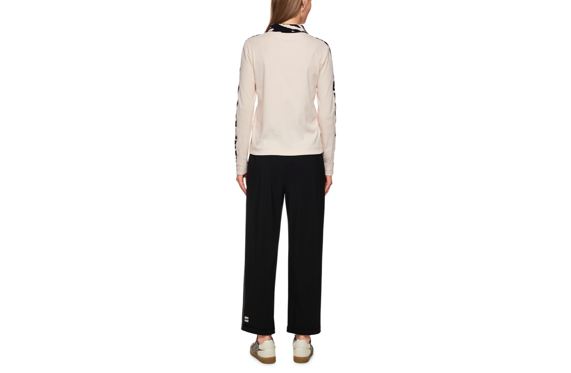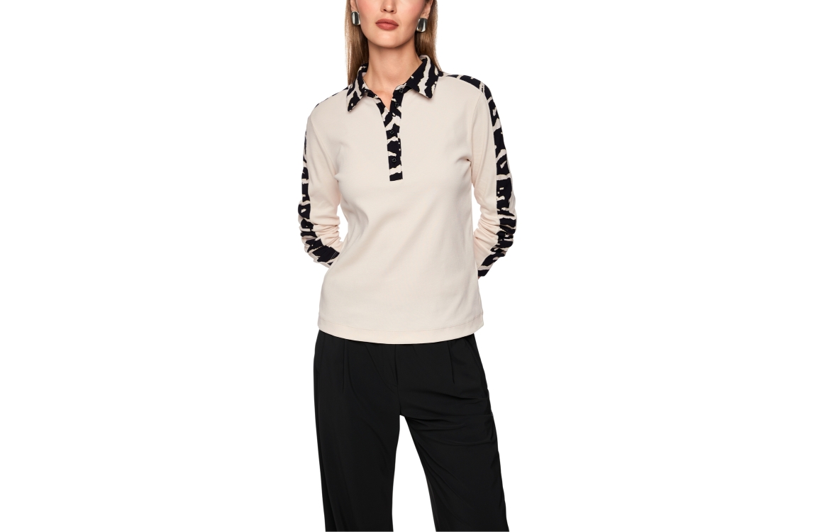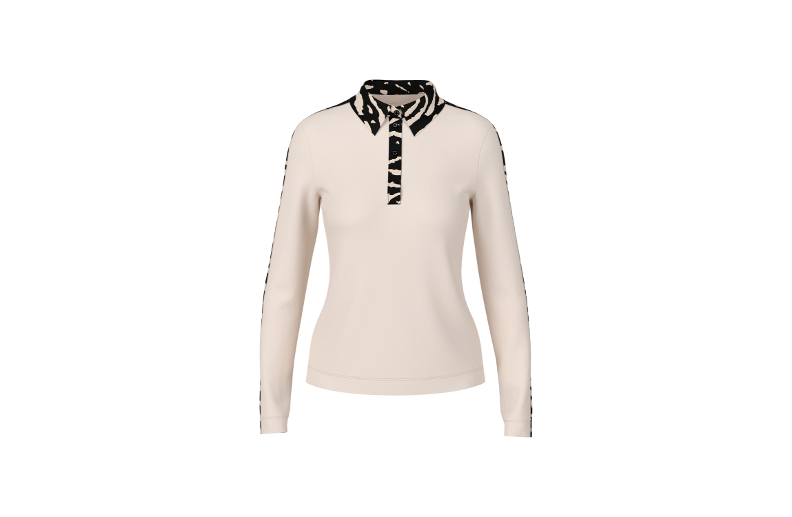 Marc Cain Sports poloshirt AS 53.06 J10. Dit rechtvallend model is voorzien van een kraag en heeft lange mouwen. Deze offwhite poloshirt van Marc Cain sluit aan de bovenzijde door middel van knopen en is bij de kraag en mouwen bewerkt met een zwart geprinte bies.
