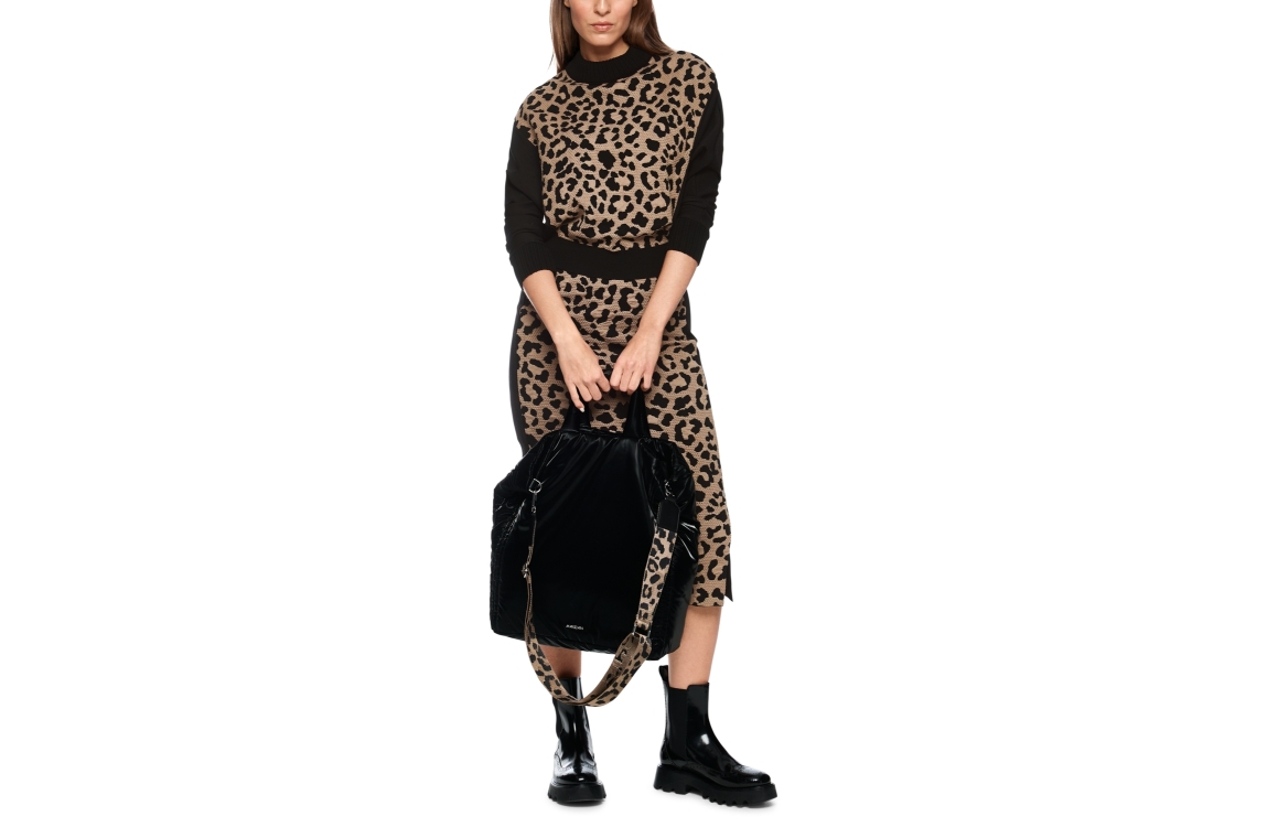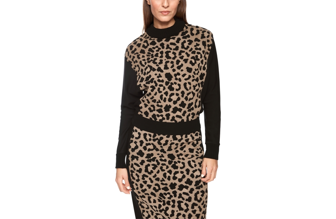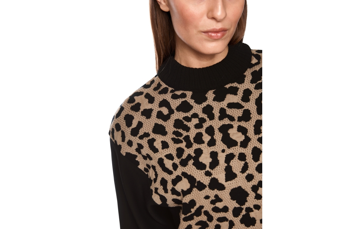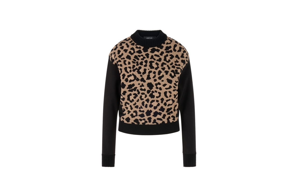 MarcCain Sports Pullover ZS 41.28 M34. Dit cropped model heeft een ronde hals en lange mouwen. Deze zwarte pullover van MarcCain is bewerkt met panterprint en beschikt over een elastische boord aan de achterzijde.