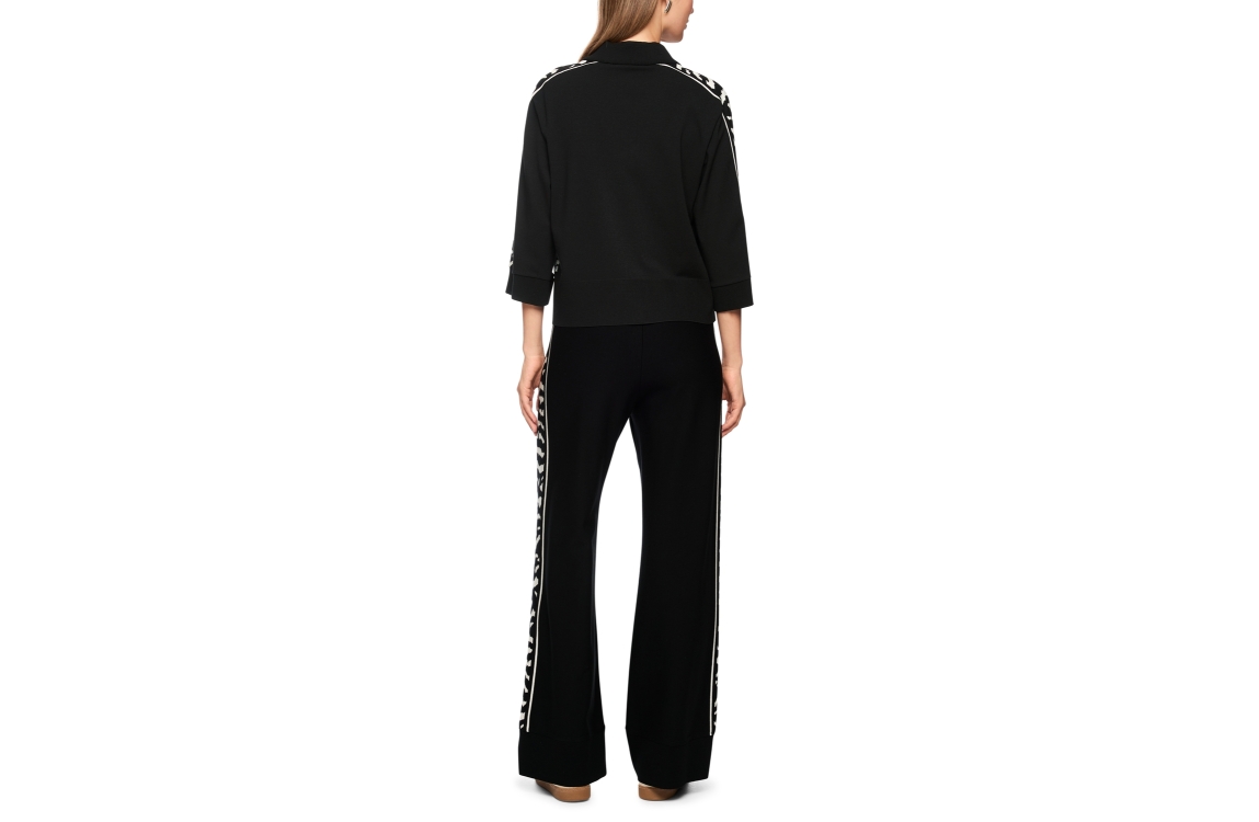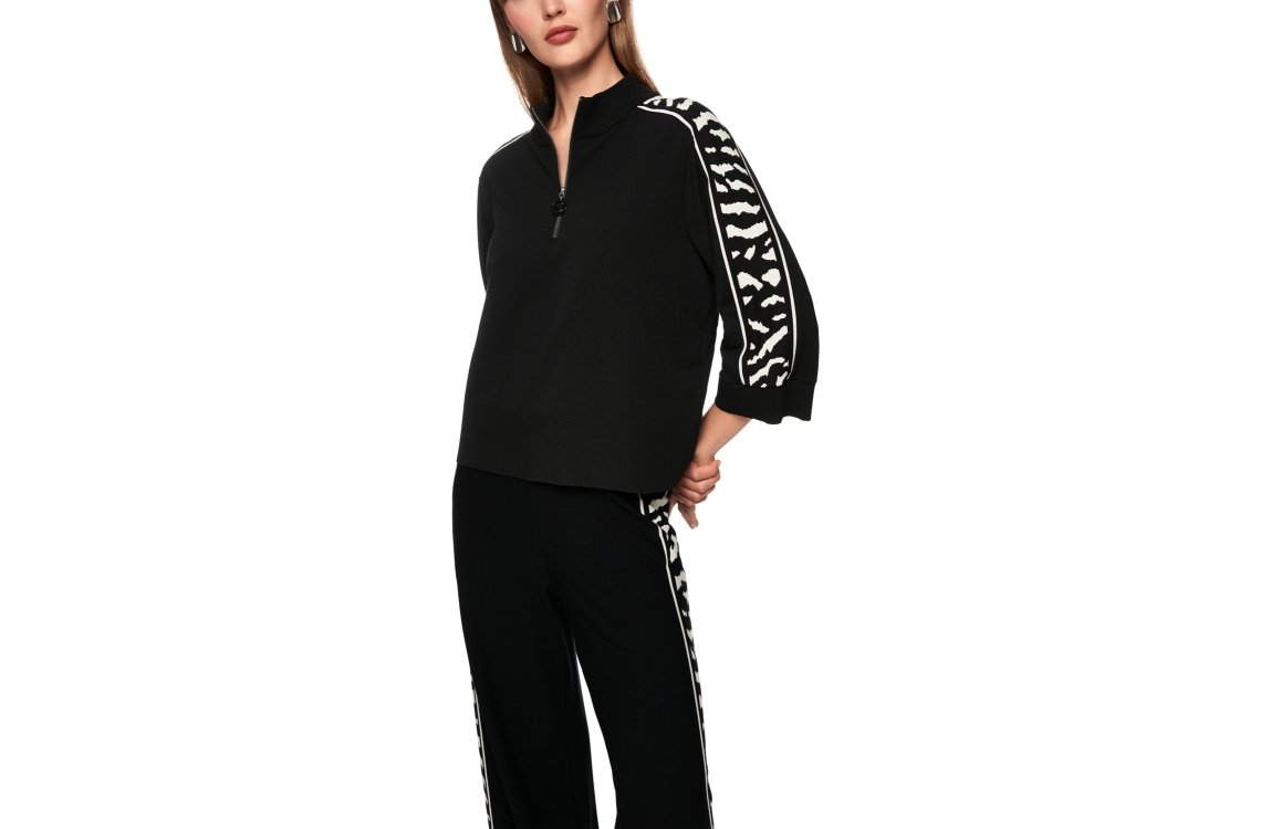 MarcCain Sports Pullover 900 Black. Dit rechtvallende model is voorzien van een opstaande kraag met een rits en driekwart mouwen. Deze zwarte pullover van MarcCain is op de mouw bewerkt met een brede contrasterende streep in dierenprint. Dit model heeft een kraag en zoom die afgewerkt zijn met brede geribde boorden.
