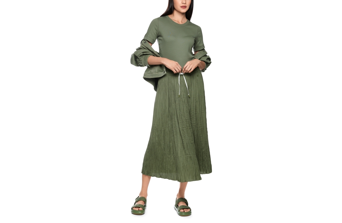 MarcCain Sports Rock 574 Olivine. Dit soepelvallende model is voorzien van een elastische boord met striksluiting. Deze groene midirok van MarcCain is bewerkt met plissés.