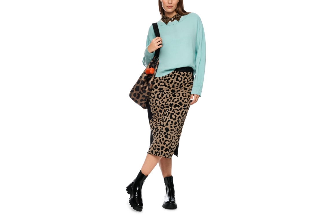 MarcCain Sports rok ZS 71.15 M34. Dit rechtvallende model sluit aan de bovenzijde door middel van een elastische boord. Deze zwarte rok van MarcCain is bewerkt met een panterprint en subtiele splitjes aan de onderzijde.