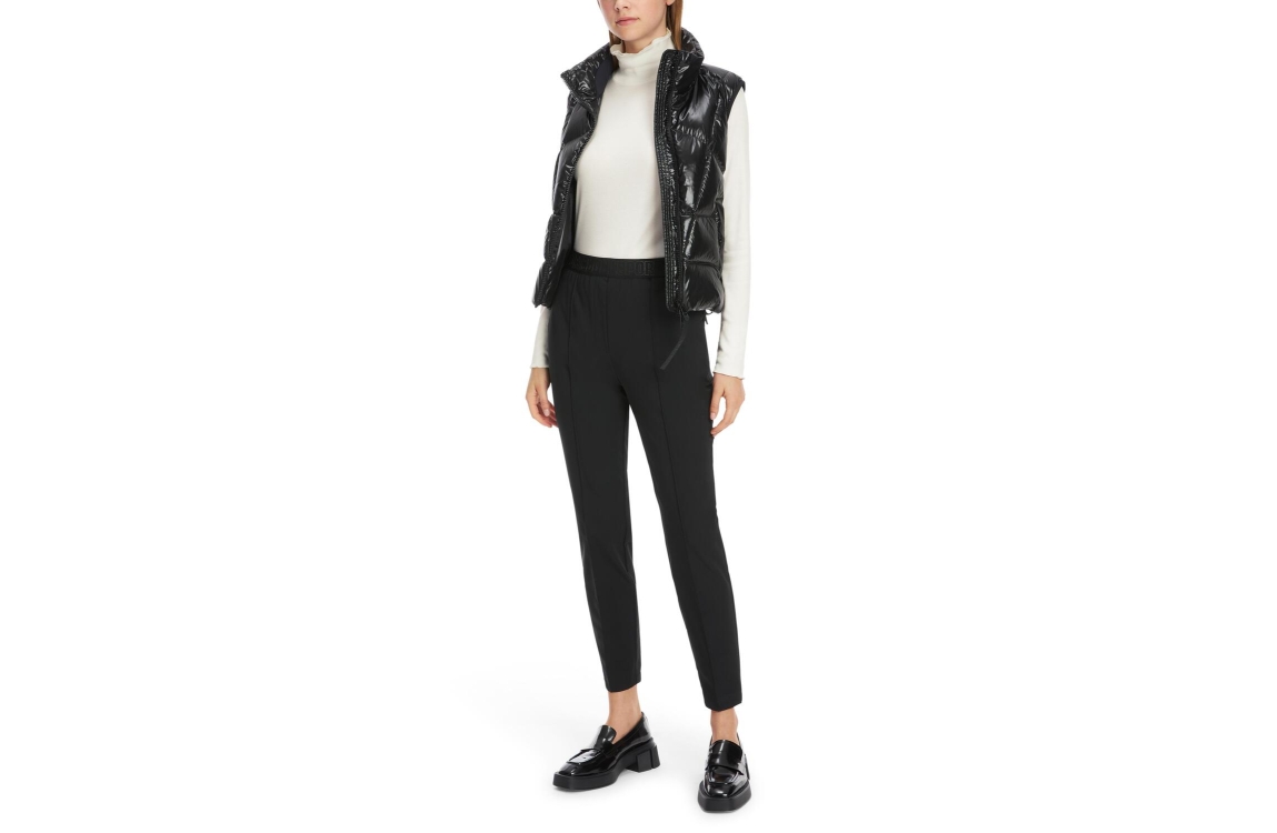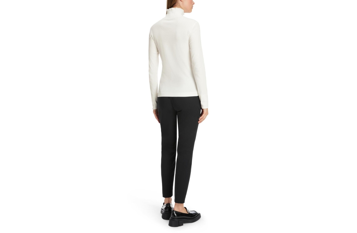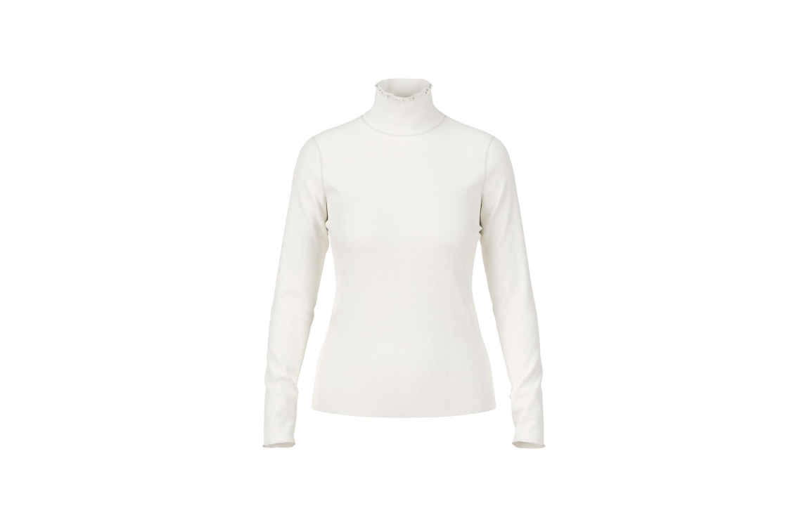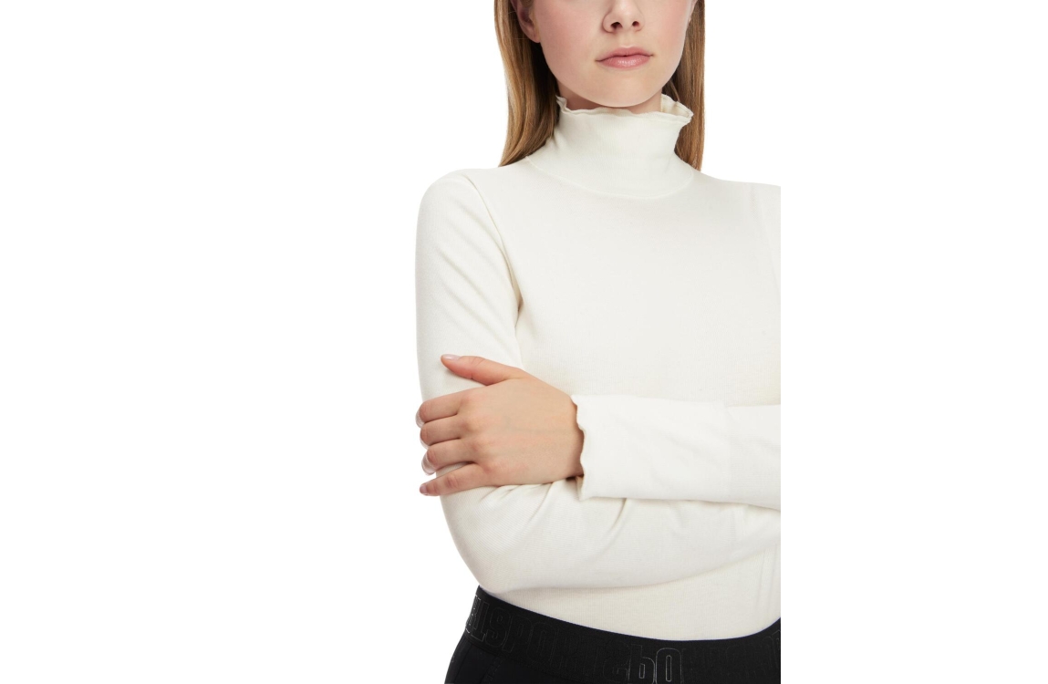 Marc Cain Sports XS 48.43 J50. Dit aangesloten model heeft een col en lange mouwen. Deze witte top van Marc Cain Sports is uitgevoerd in een subtiele ribstof en is afgewerkt met ruches op de boorden.
