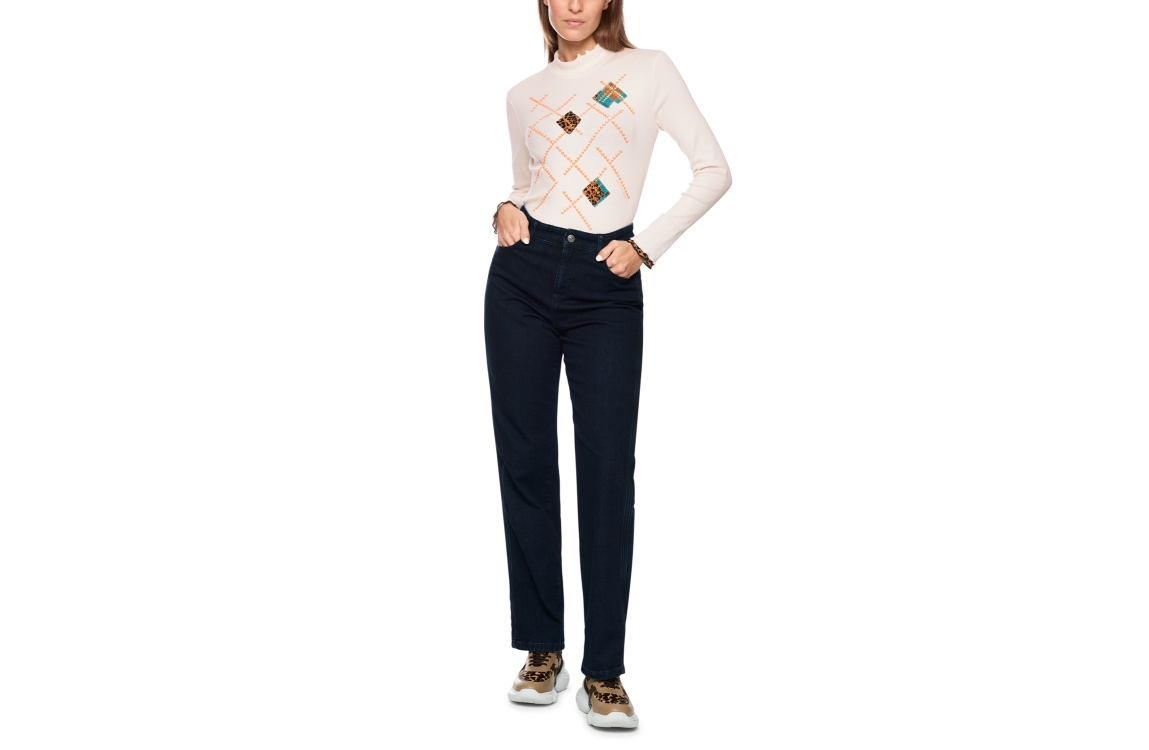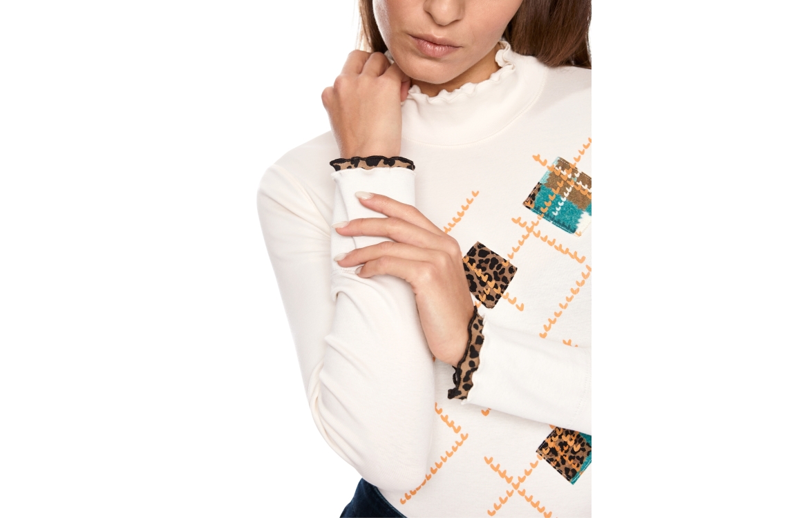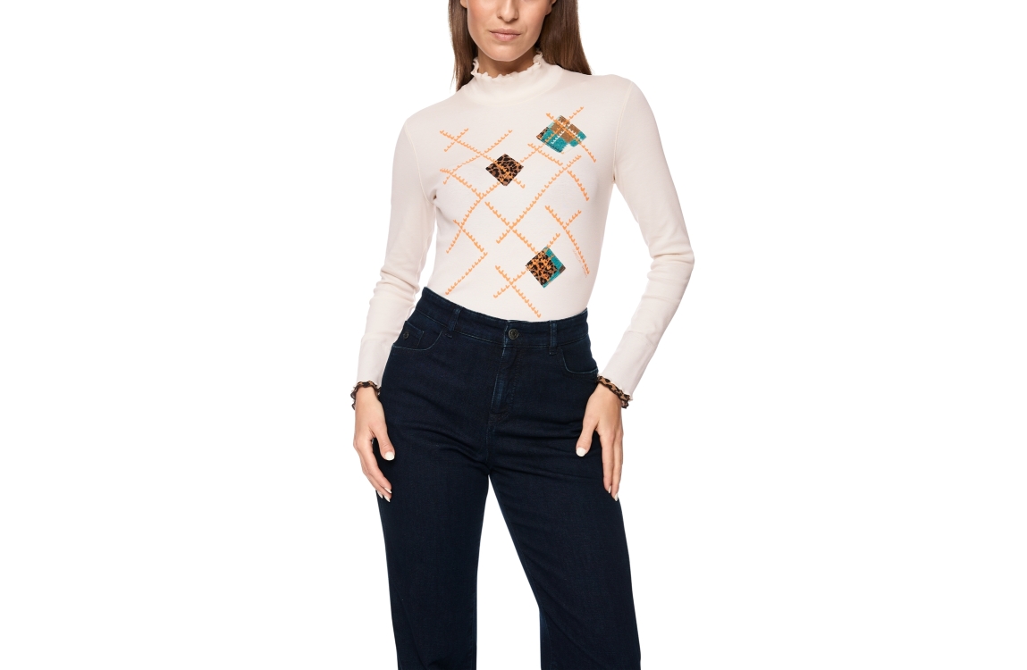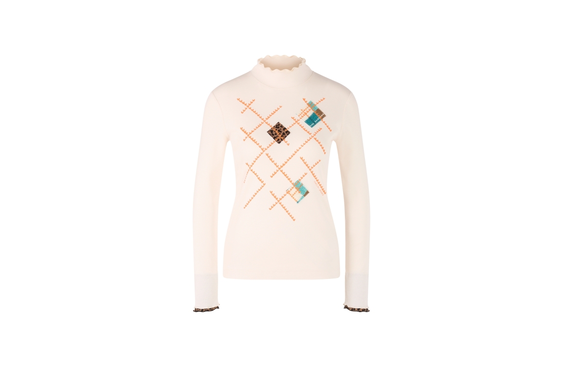 MarcCain Sports pullover ZS 48.43 J85. Dit aangesloten model heeft een col en lange mouwen. Deze witte pullover van MarcCain is bewerkt met een ruitjes motief en pantermouwtjes.