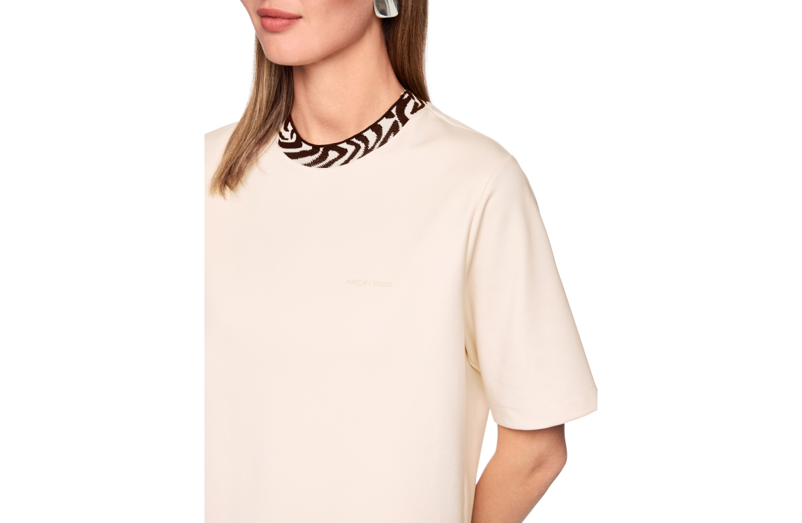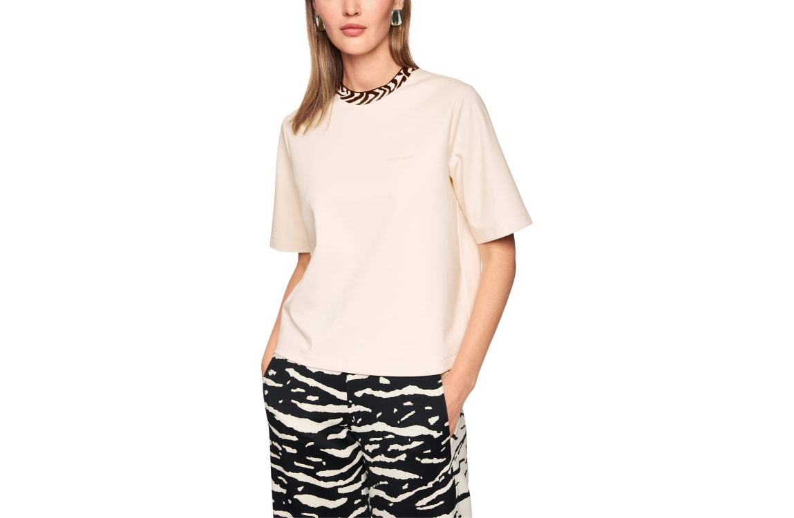 MarcCain Sports T-Shirt 153 Magnolia. Dit rechtvallende model is voorzien van een ronde hals en heeft korte mouwen. Dit beige T-shirt van Marc Cain is bij de kraag bewerkt met een contrasterende kleur. Dit model is op de voorkant en onderaan de anderkant afgewerkt met een klein Marc Cain Sport-logo-embleem.