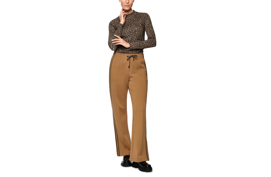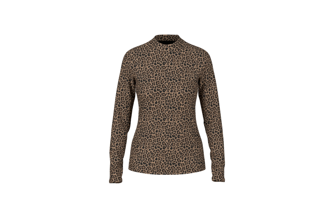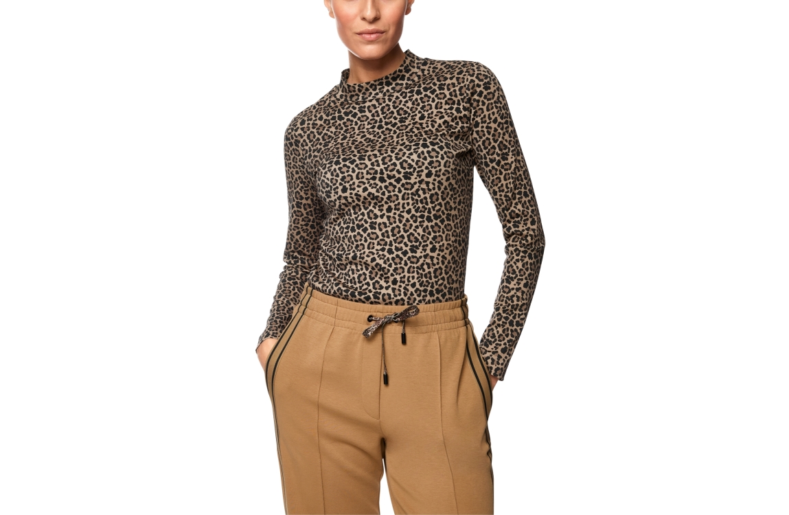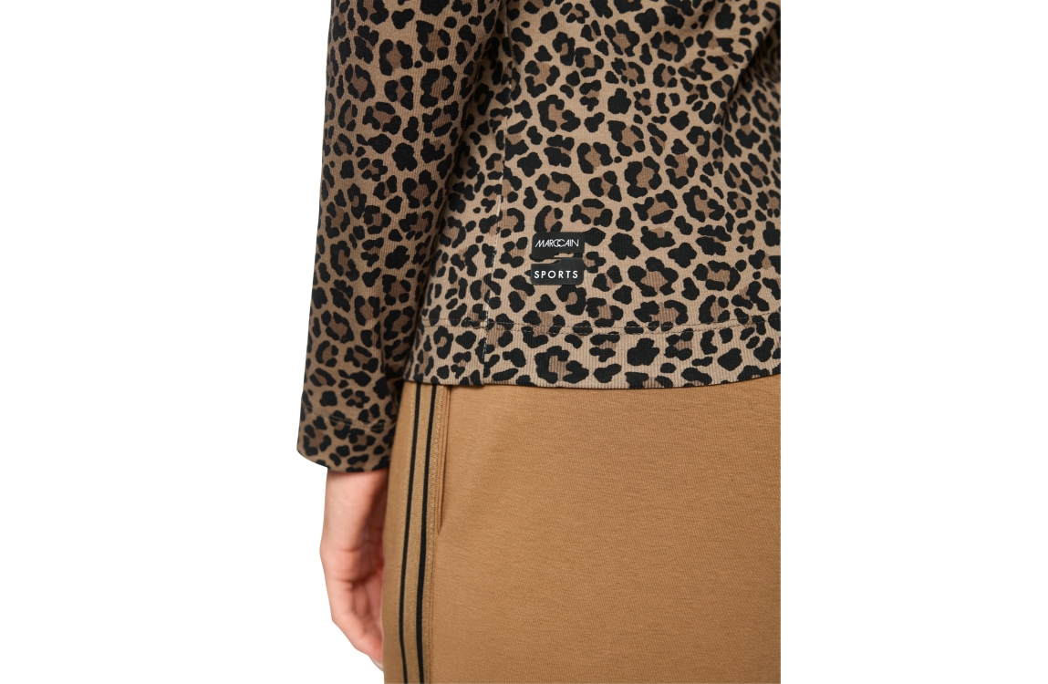 MarcCain Sports top ZS 48.41 J6. Dit aangesloten model heeft een col en lange mouwen. Deze bruine top van MarcCain is bewerkt met een leopard print.