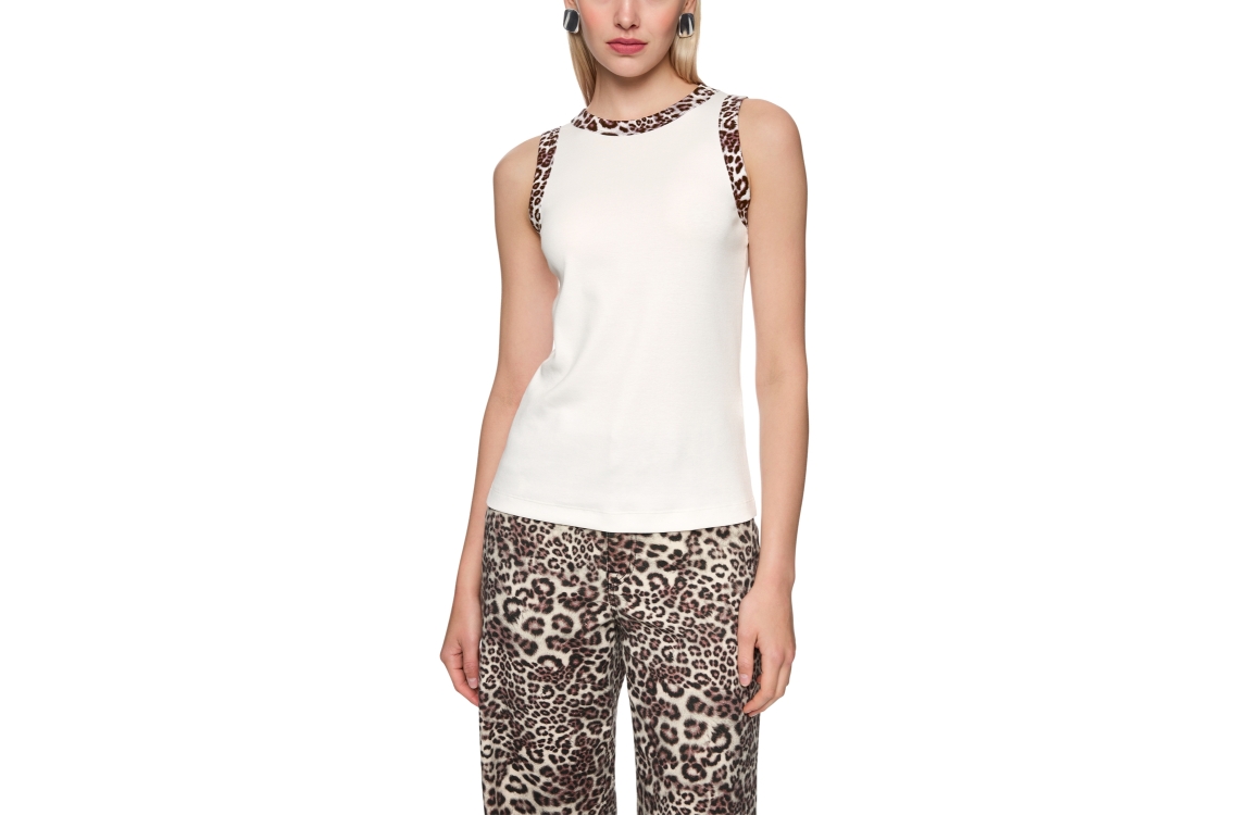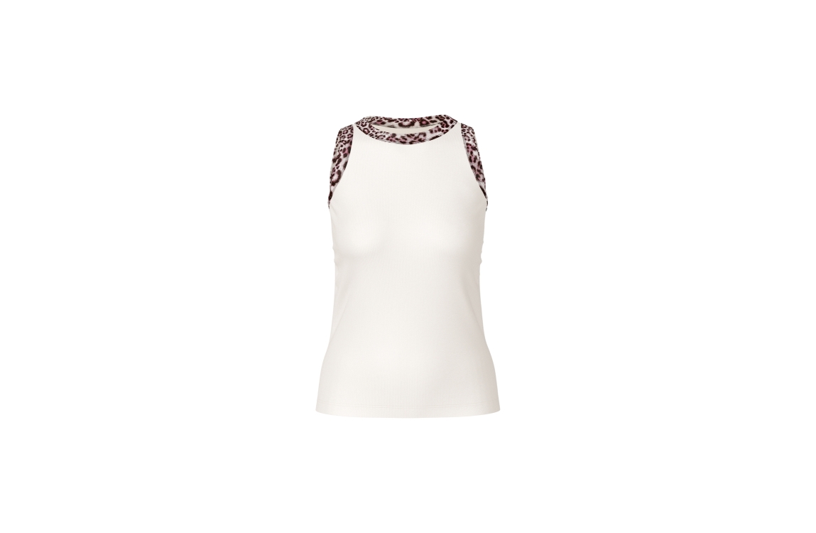Marc Cain Sports AS 61.03 J55. Dit aangesloten model is voorzien van een ronde hals en is mouwloos. Deze witte top van Marc Cain Sports is uitgevoerd in een ribkwaliteit en is afgewerkt met biezen bewerkt in een panterprint.