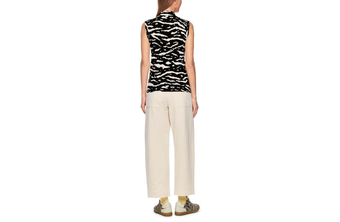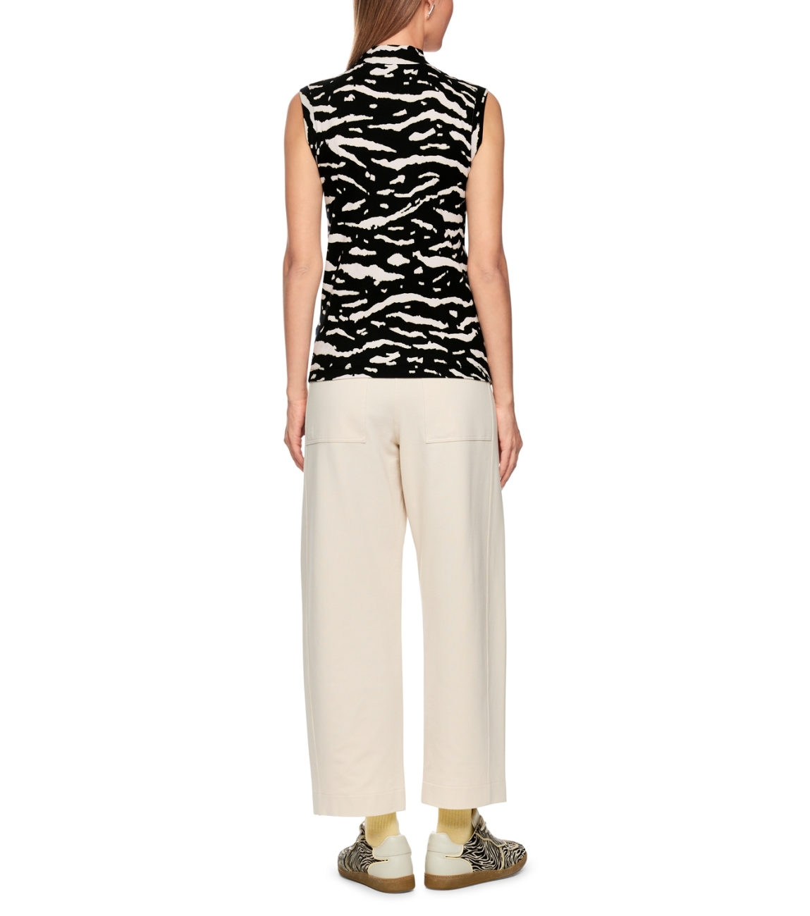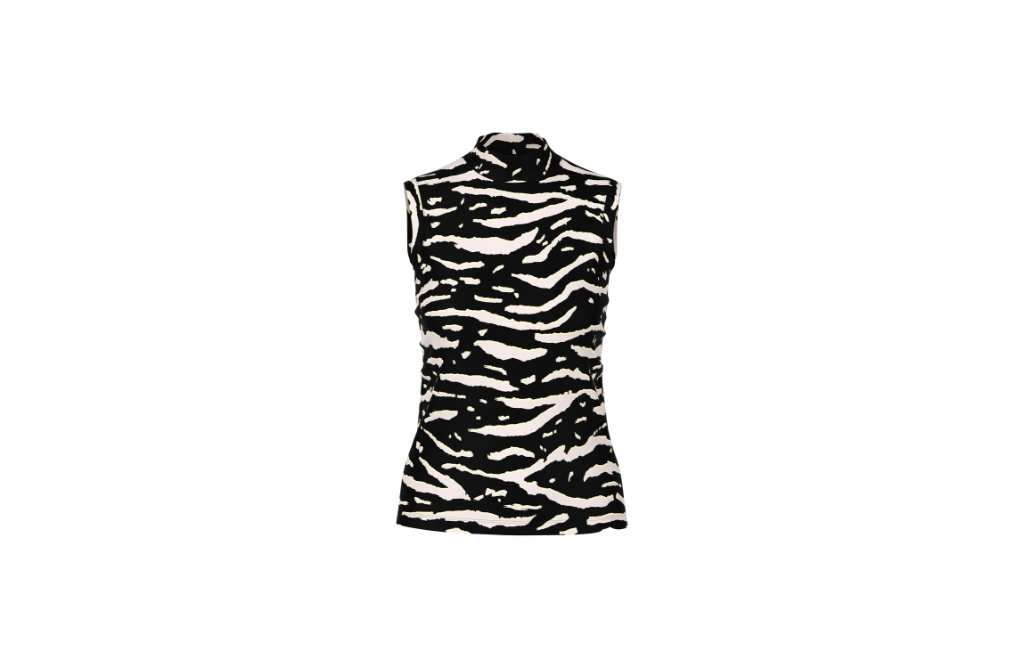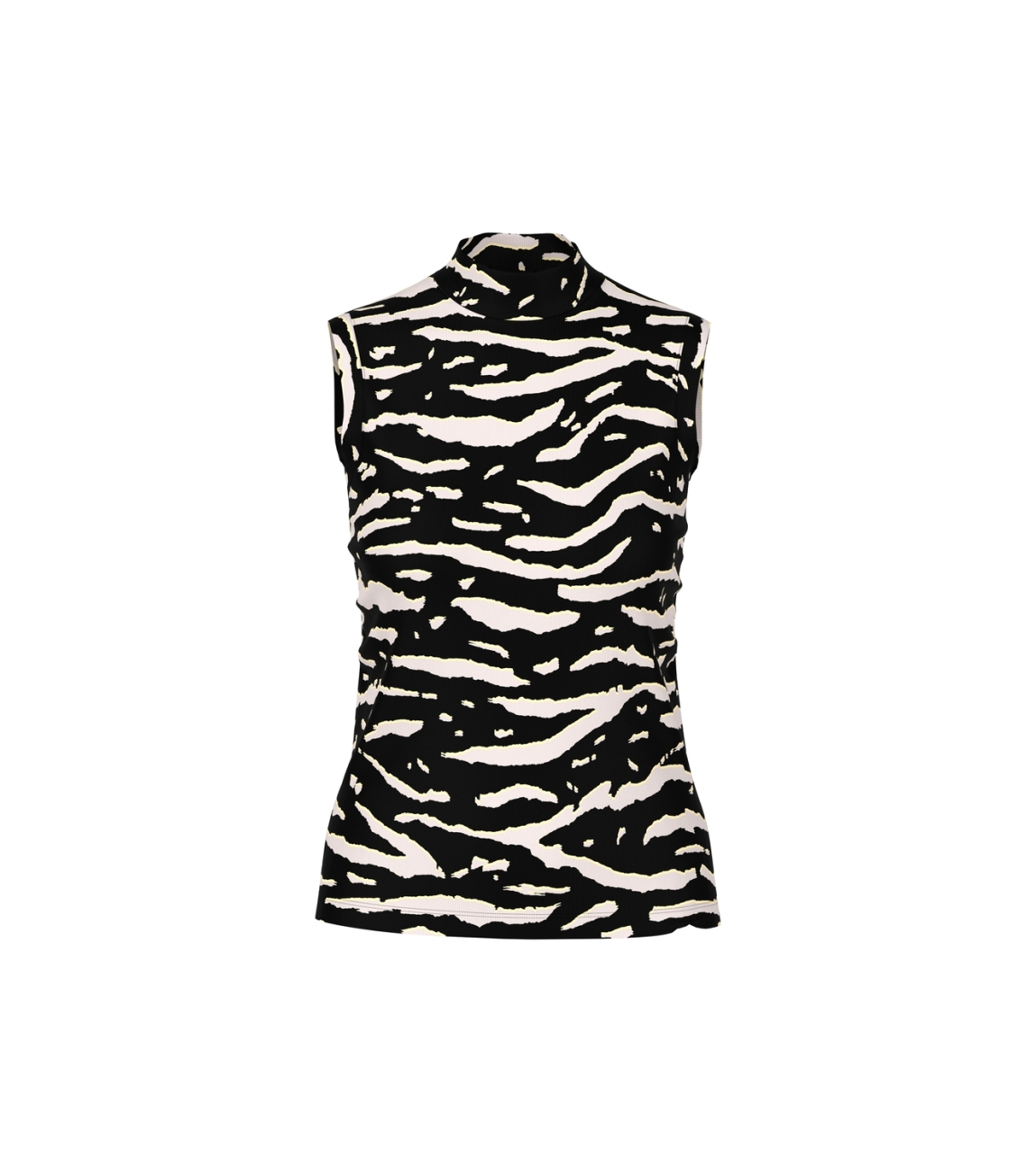 Marc Cain Sports AS 61.02 J10. Dit aangesloten model is voorzien van een turtle neck en is mouwloos. Deze zwarte top van Marc Cain is bewerkt met een offwhite zebraprint.