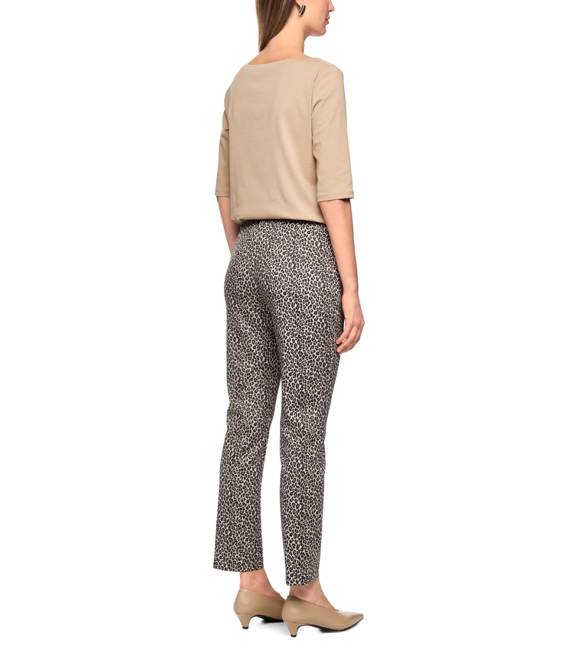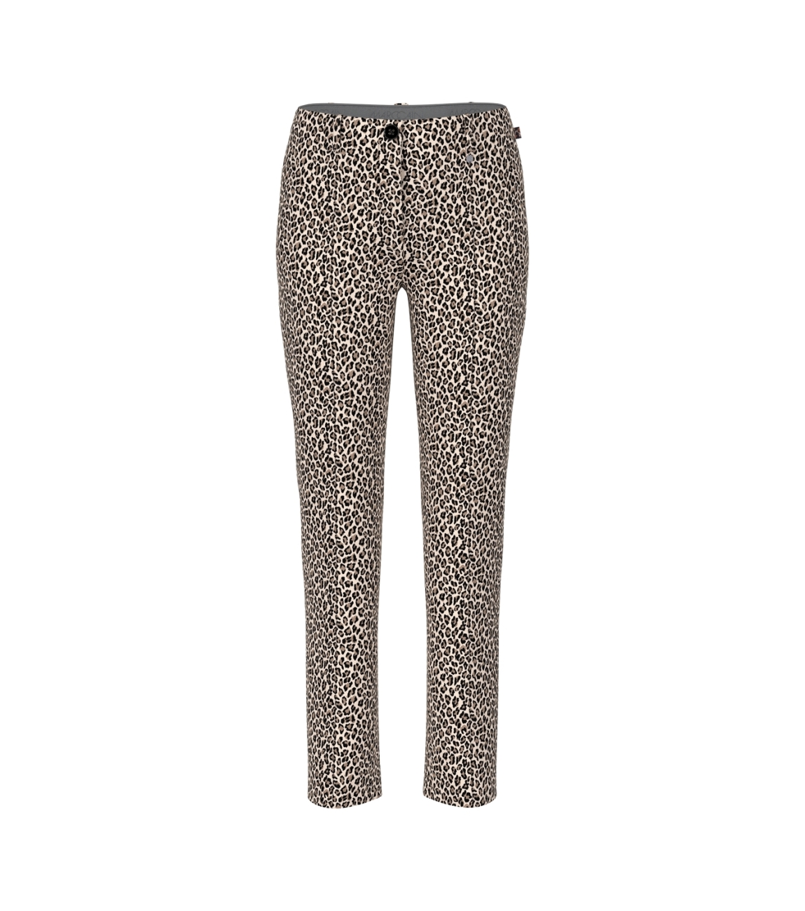 Marc Cain broek AP 81.11 J01 153. Dit regular fit model sluit aan de voorzijde door middel van een knoop- en ritssluiting en is voorzien van ceintuurlussen. Deze bruine broek van Marc Cain is all-over bewerkt met een panterprint en is uitgevoerd in stretchkwaliteit.
