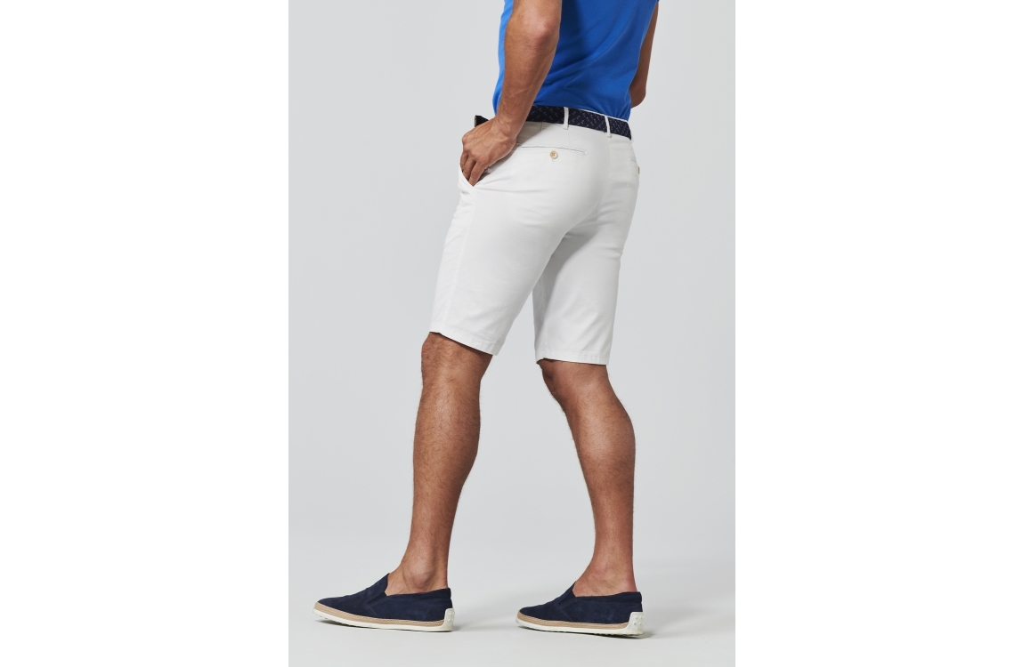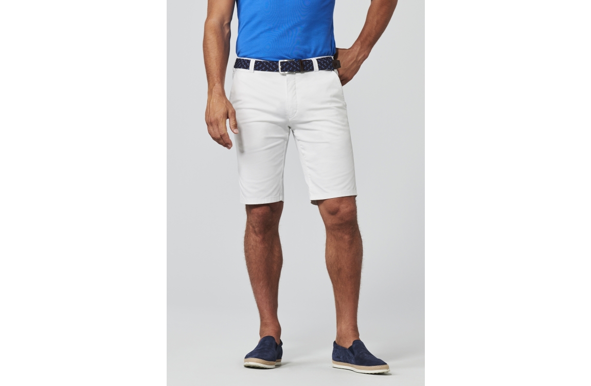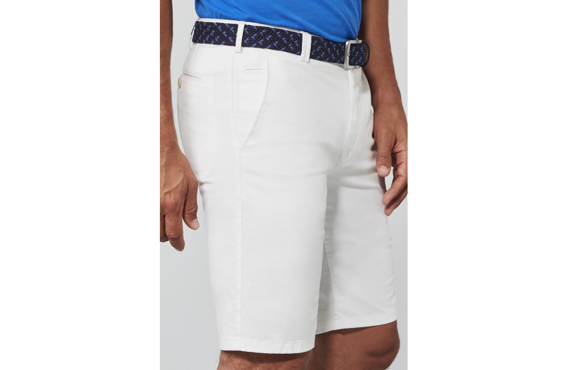 Meyer korte broek 1401313000. Dit rechtvallend model is voorzien van ceintuurlussen en heeft twee steekzakken, deze witte korte broek van Meyer sluit door middel van rits en knoop.